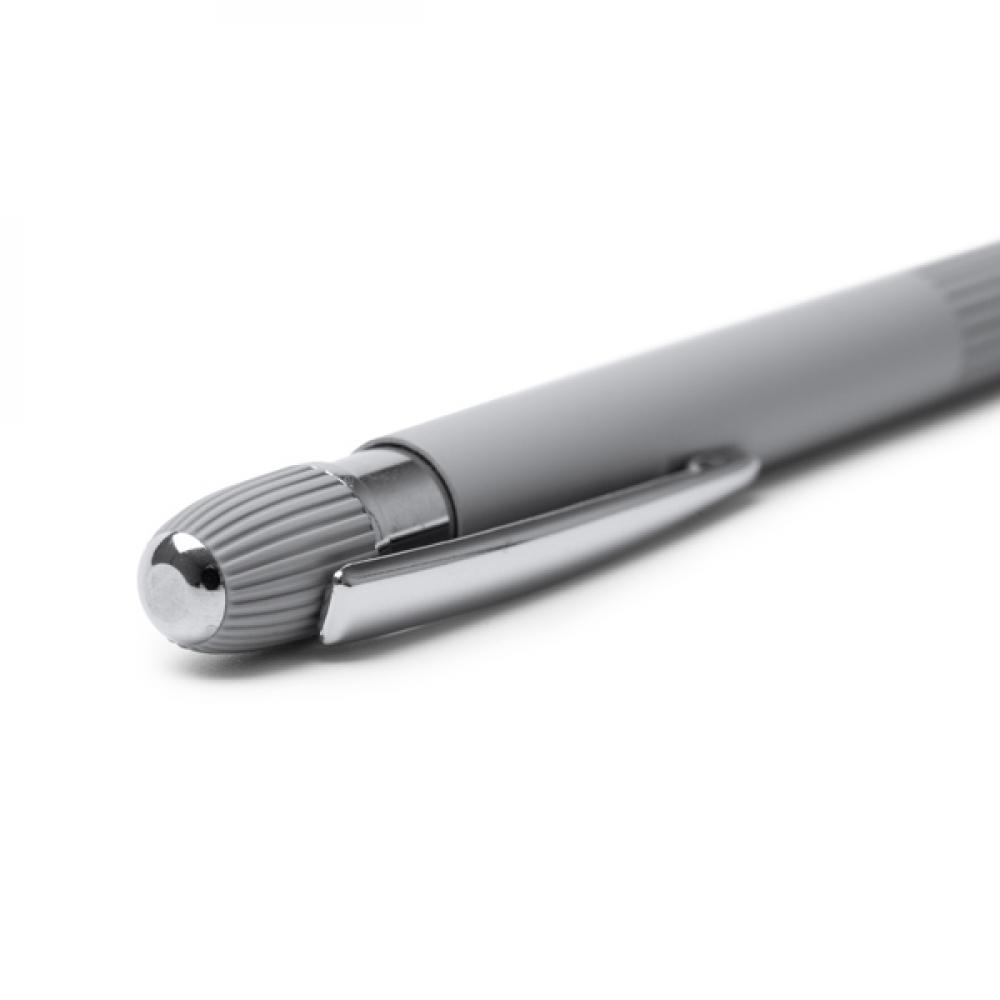 Ручка с корпусом из переработанного алюминия с полосатым упором и матовым резиновым покрытием. Детали в хромовой отделке. Крупный чернильный стержень с синим цветом.