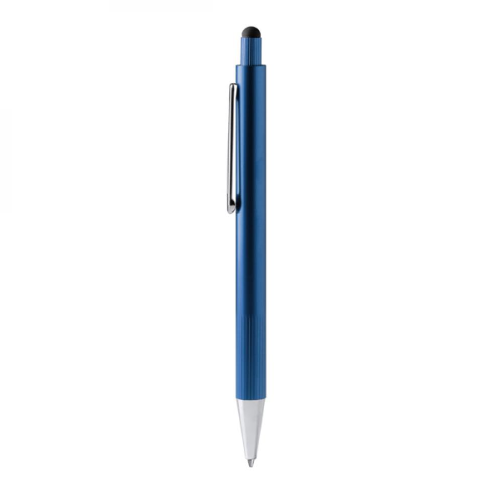 Шариковая ручка из алюминия с полосатым узором в металлическом отделении и сенсорным указателем. Крупный чернильный стержень с синим цветом.