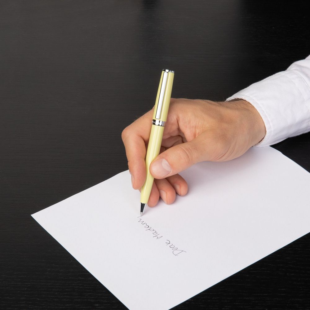 Наш культовый силуэт Gear возвращается с вечной изюминкой, с упрощённым логотипом в виде кольца с глянцевым лаком. Эта новая версия Gear уже ощущается как икона и, вероятно, является нашим самым коммерчески успешным изделием. Она отличается роскошным глянцевым лаком на фирменной оправе. Это изысканный взгляд на минималистичный дизайн, который мгновенно становится классическим письменным инструментом. Доступен в различных цветах, включая этот красивый пастельный жёлтый оттенок.