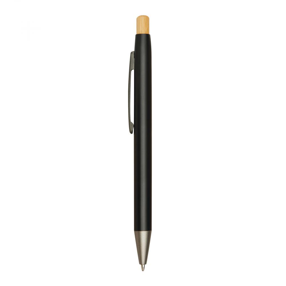 Шариковая ручка из алюминия BAMBOO PUSHER: матовый металлический корпус из переработанного алюминия, механизм нажима, кнопка из бамбука, синяя паста