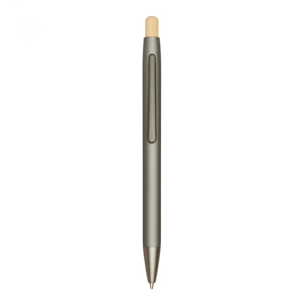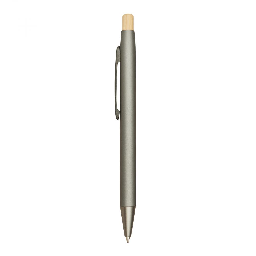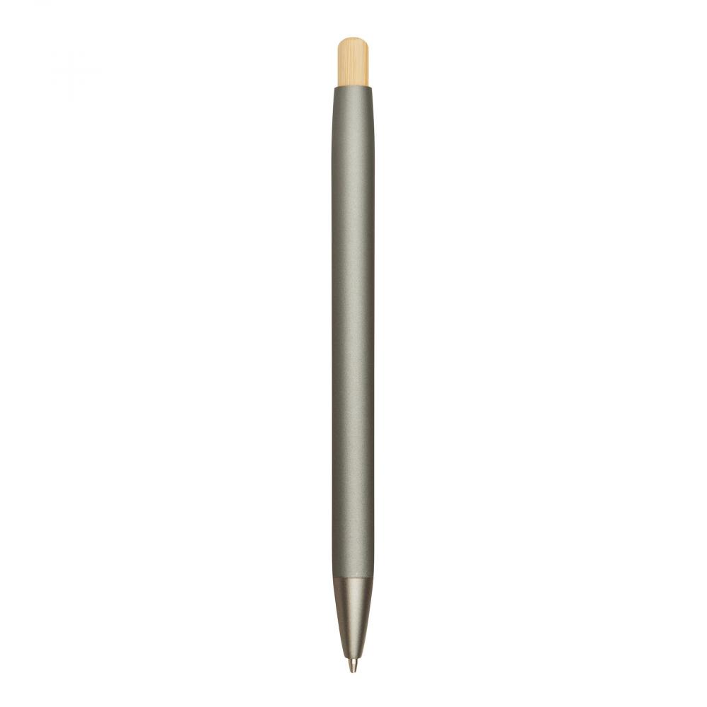 Шариковая ручка из алюминия BAMBOO PUSHER: матовый металлический корпус из переработанного алюминия, механизм нажима, кнопка из бамбука, синяя паста