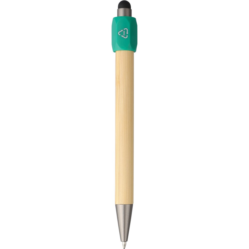 Шариковая ручка из бамбука с функцией вращающегося спиннера из переработанного ABS, черным стилусом на нажимном механизме, оснащена механизмом нажатия, размером пишущего узла 1,0 мм, синим чернилами и примерной длиной письма около 800 метров, включает в себя значок из переработанного ABS на изделии.