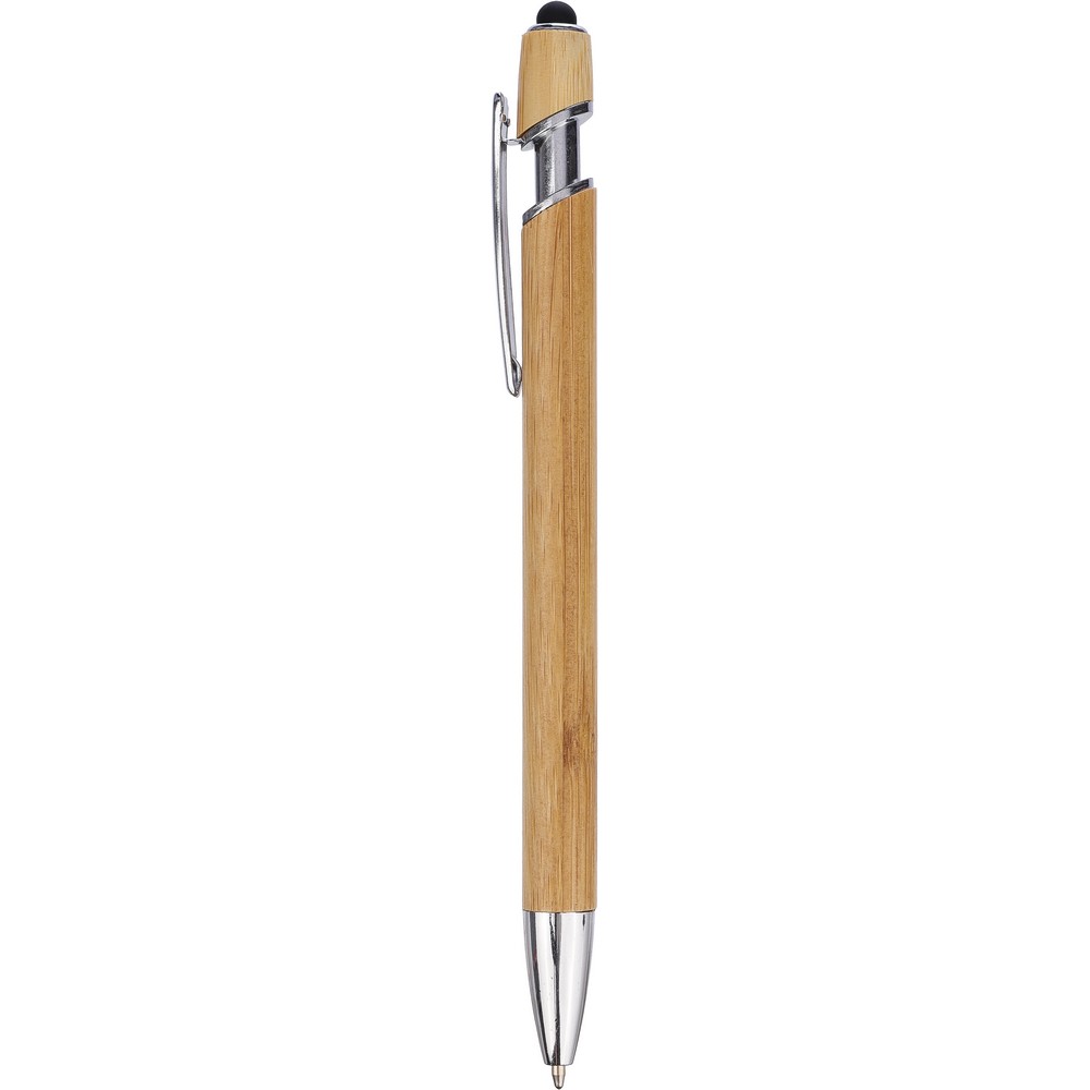 Шариковая ручка, сенсорный стилус с деталями из хромированного металла, кончик стилуса обеспечивает работу с сенсорным экраном, клип для удобного крепления на кармане или обложке блокнота, пишет синим цветом, длина письма около 800 м, изделие изготовлено из бамбука, пластика и металла.