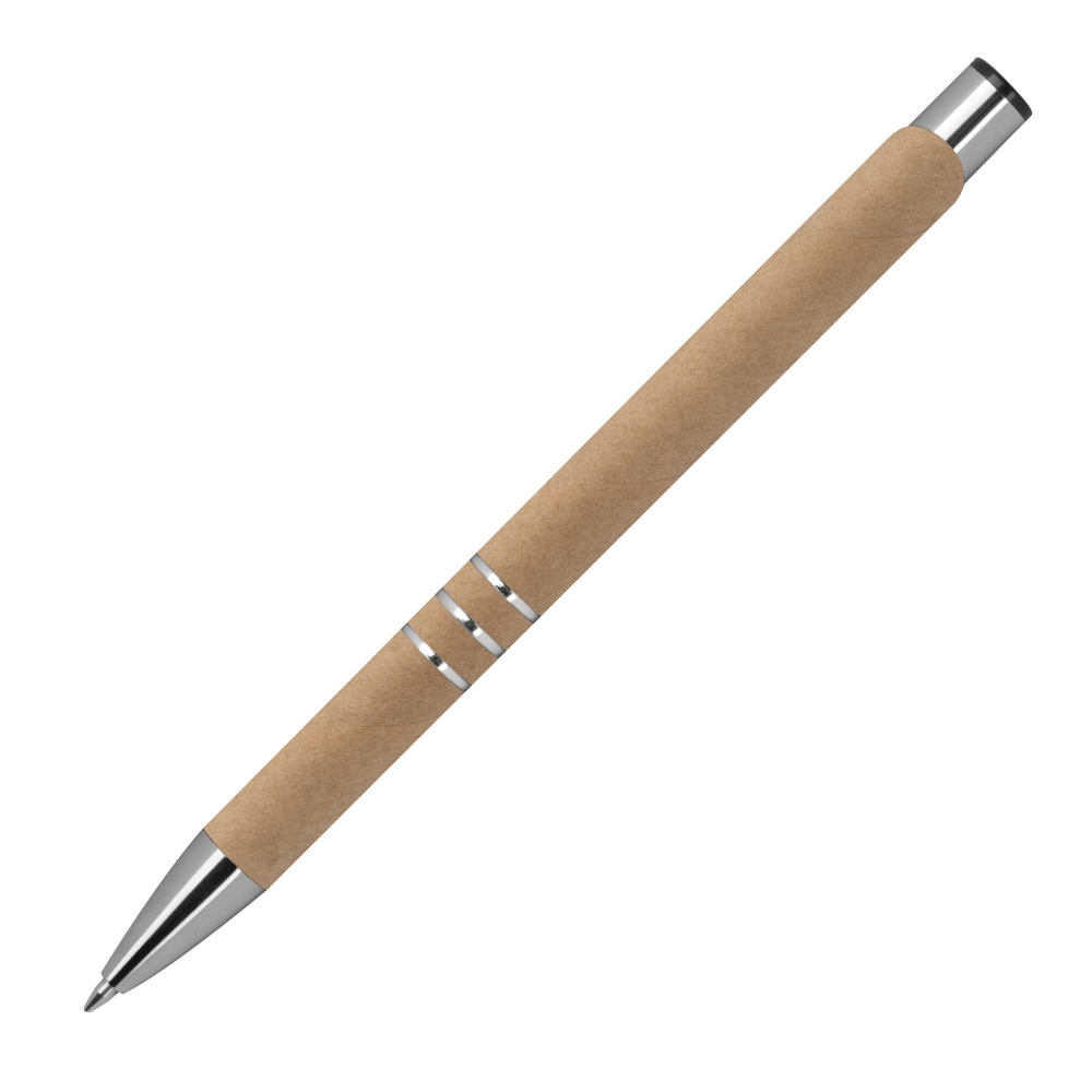 Экологически чистая шариковая ручка, изготовленная из переработанной бумаги, с тремя декоративными кольцами и большим синим стержнем.