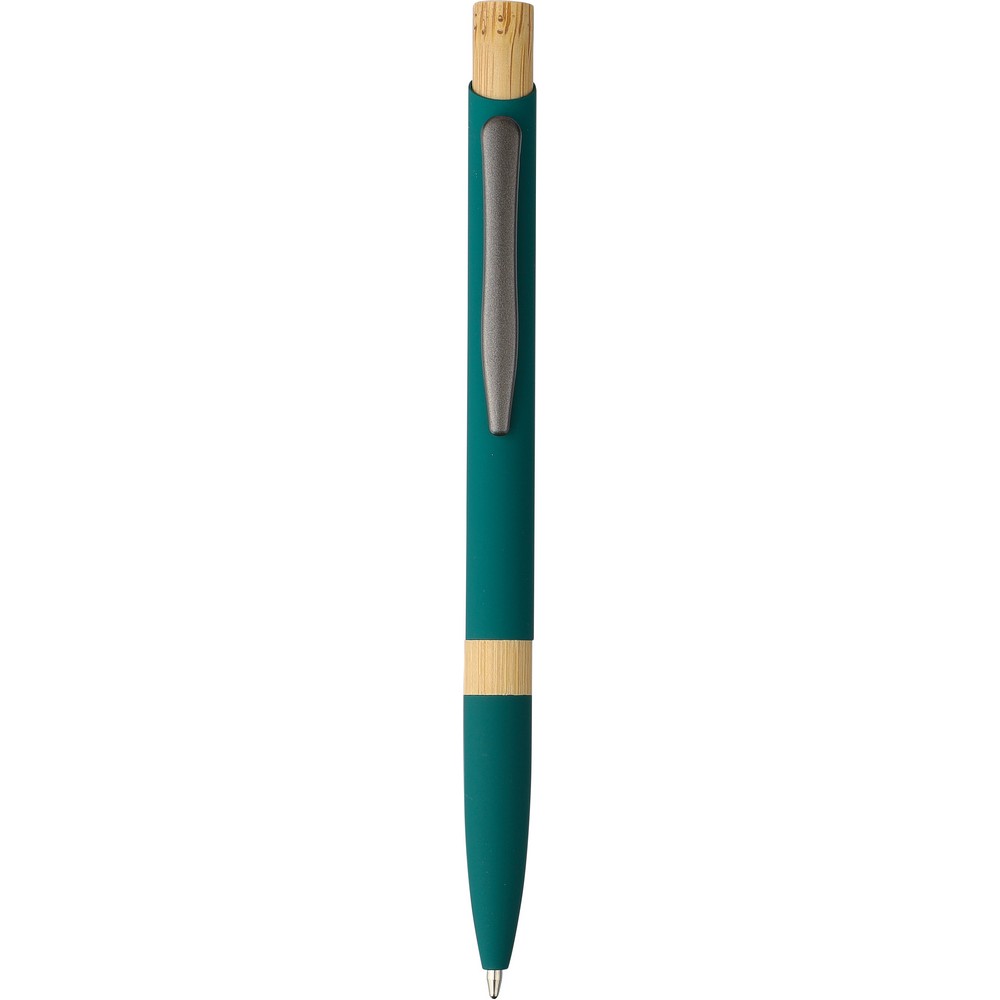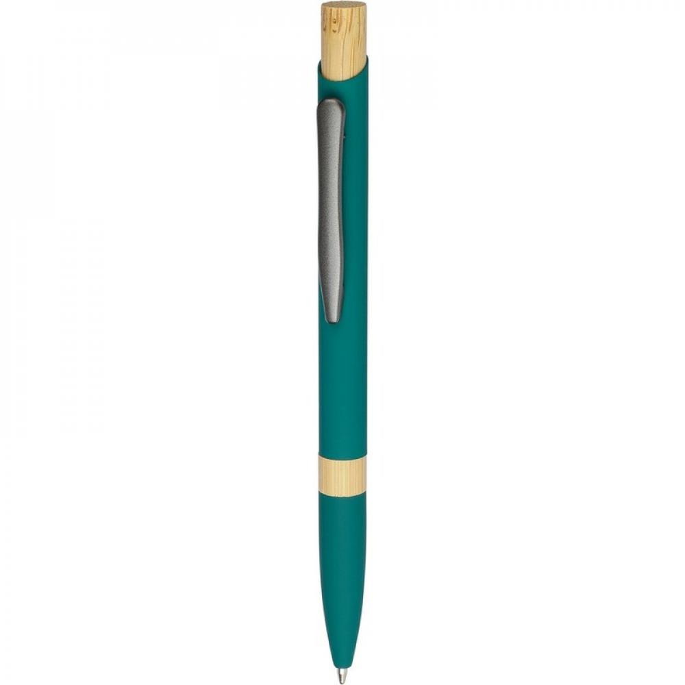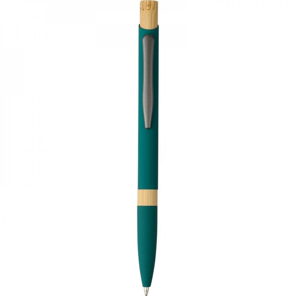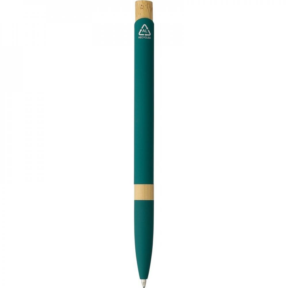 Шариковая ручка из переработанного алюминия с резиновым покрытием, бамбуковым нажимным механизмом, бамбуковым кольцом на корпусе, оснащена механизмом нажатия, размер пишущего узла 1,0 мм, пишет синим цветом с примерной длиной письма до 800 метров, включает в себя значок из переработанного алюминия на изделии.
