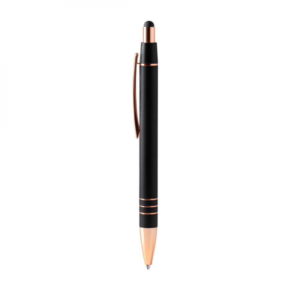 Ручка с кнопкой из металла с матовым покрытием и деталями из медной проволоки. Сенсорный указатель на кнопке. Сменный стержень для чернил синего цвета.