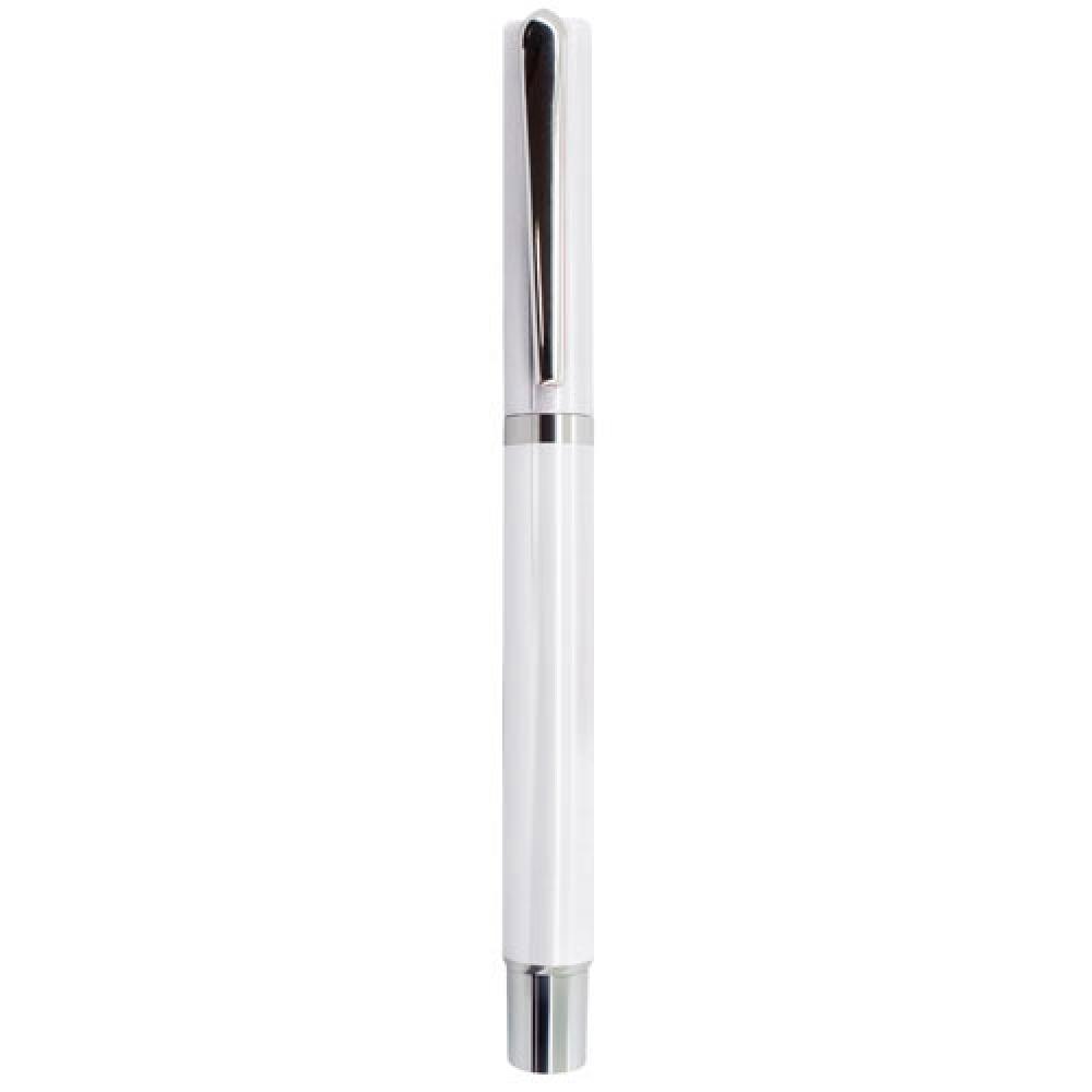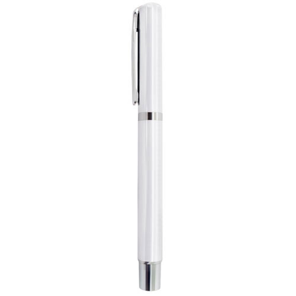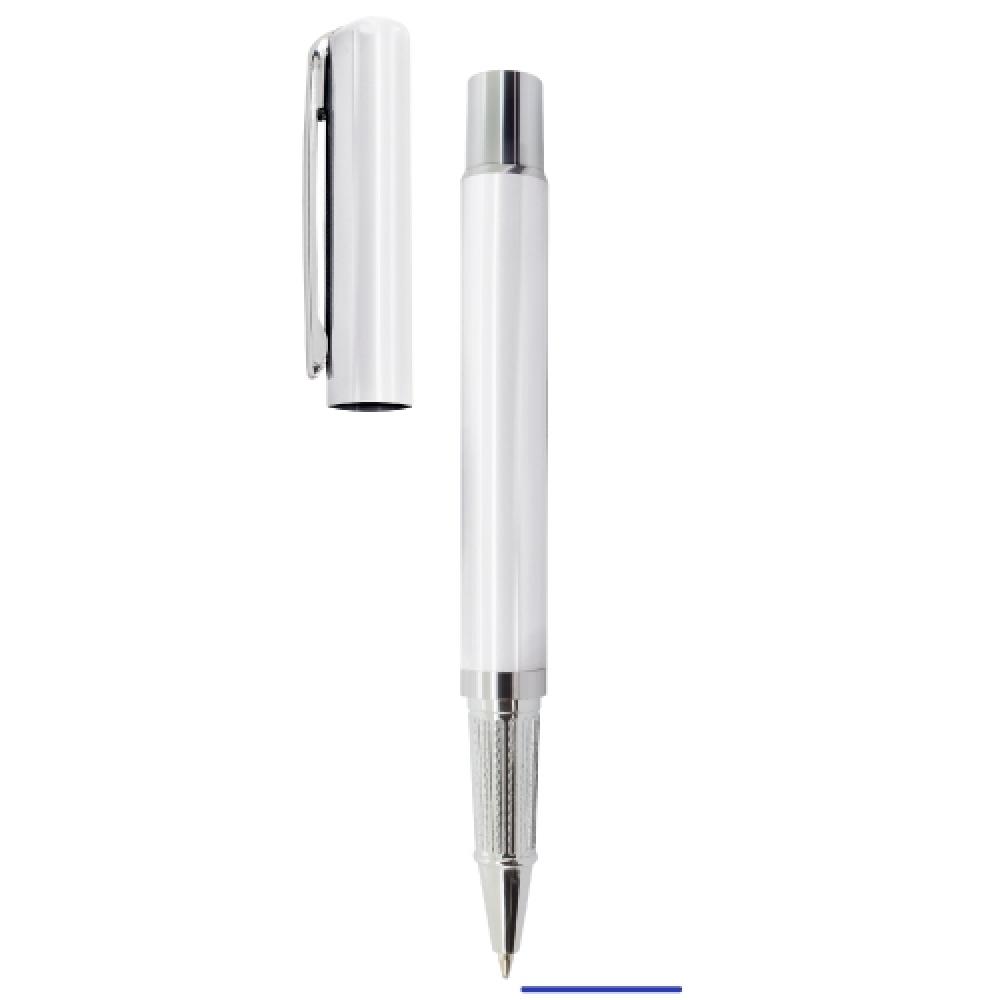 Отличная ручка-роллер с металлическим зажимом, металлическими деталями и гелевой чернилами, имитирующими письмо перьевой ручкой. Гелевые чернила (синие), толщина линии 0,7 мм.