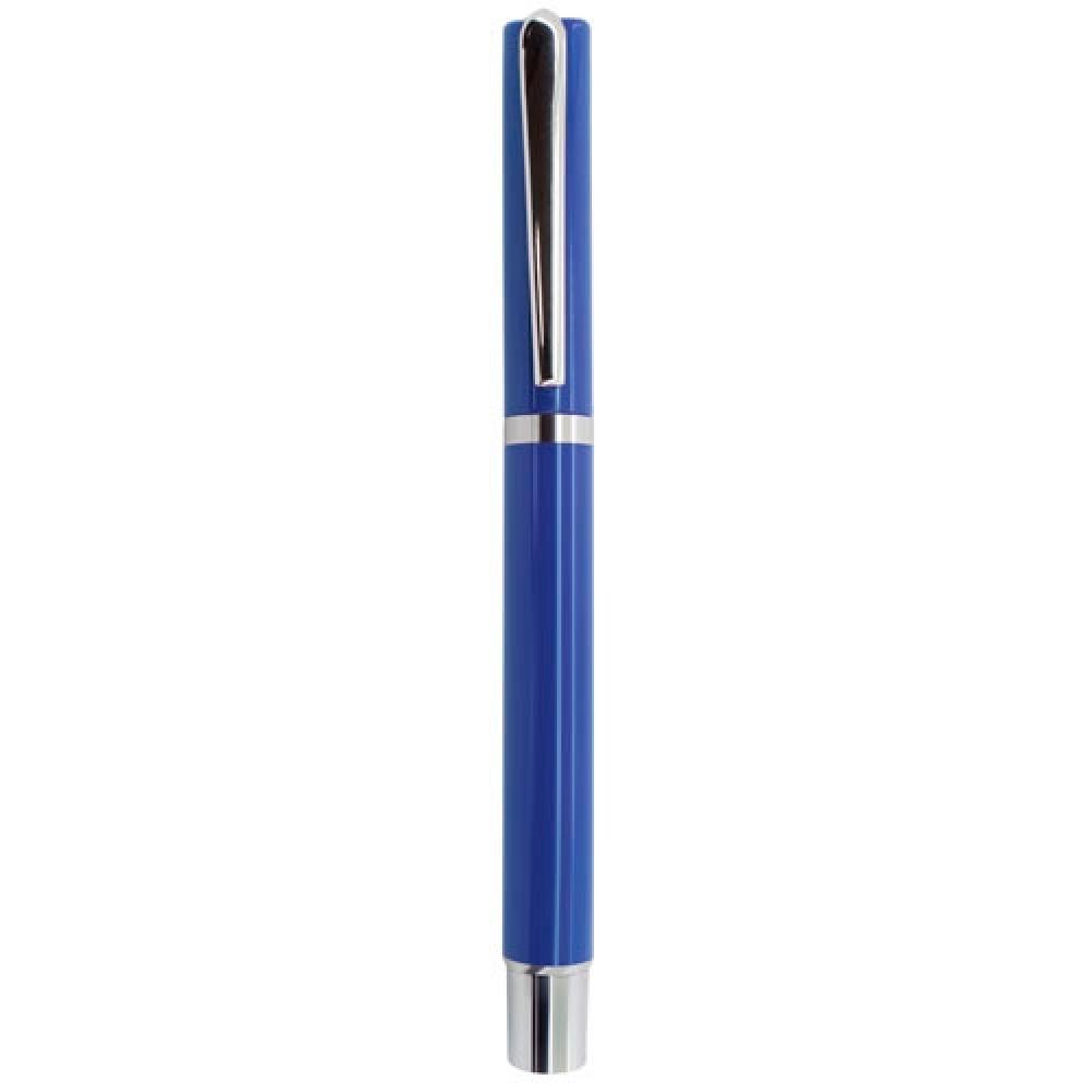 Отличная ручка-роллер с металлическим зажимом, металлическими деталями и гелевой чернилами, имитирующими письмо перьевой ручкой. Гелевые чернила (синие), толщина линии 0,7 мм.