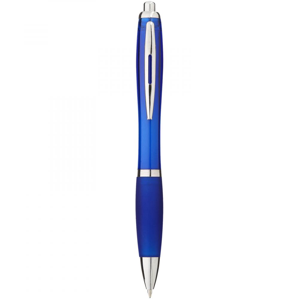 Шариковая ручка с нажимным механизмом и мягкой прорезиненной ручкой.