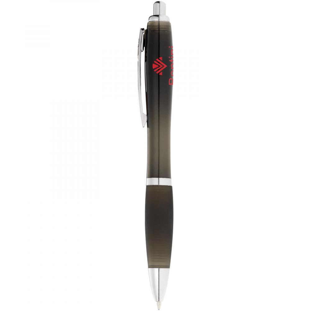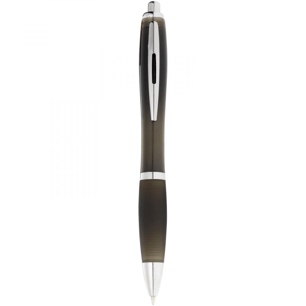 Шариковая ручка с нажимным механизмом и мягкой прорезиненной ручкой.