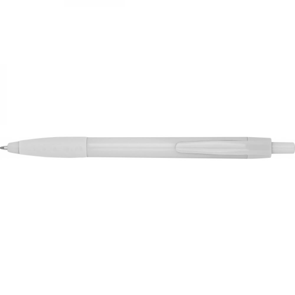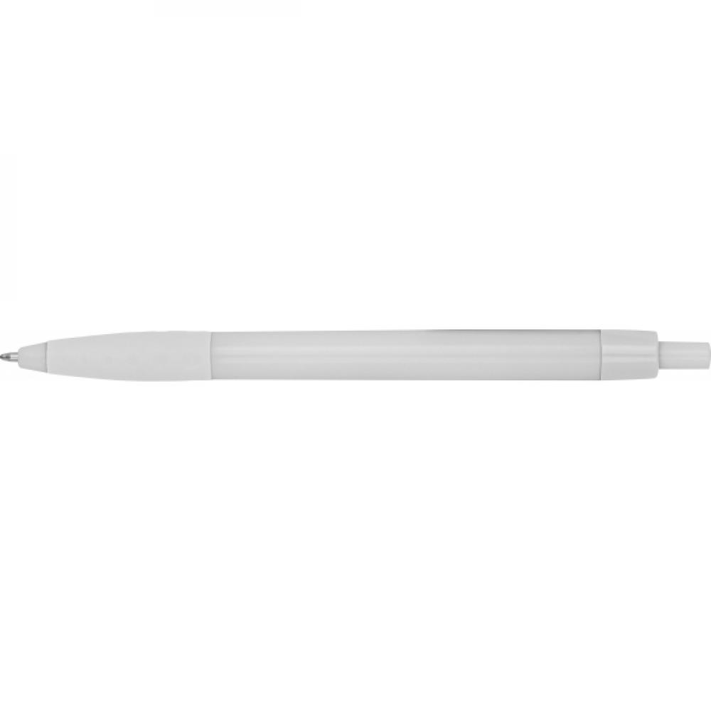 Красивая белая шариковая ручка с цветными акцентами и резиновой зоной для удержания. Ручка оснащена синим пластиковым стержнем для письма. Мы печатаем вашу рекламу на правой стороне клипа.
