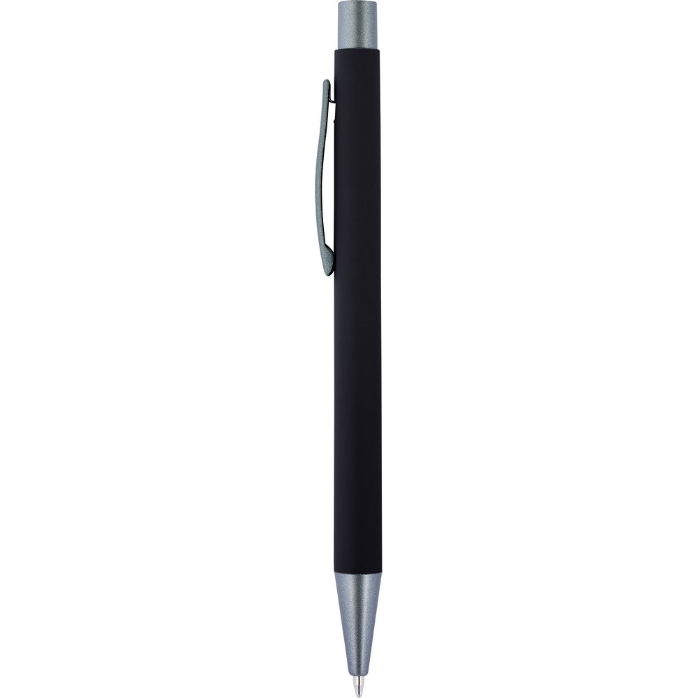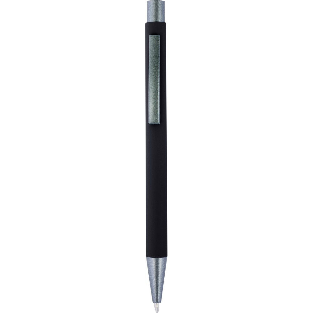 Ручка шариковая с цветным резиновым корпусом и серыми деталями, зеркальная поверхность после гравировки