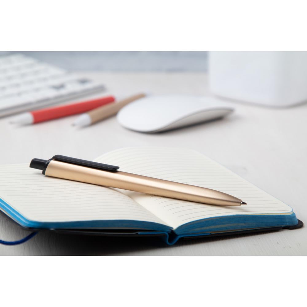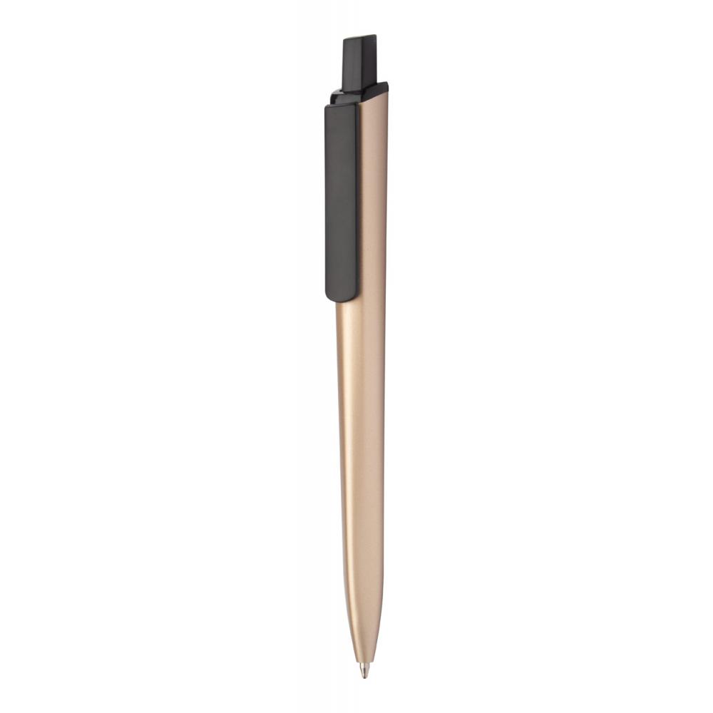 Пластиковая шариковая ручка с черными деталями и матовым металлическим покрытием. С синим стержнем.