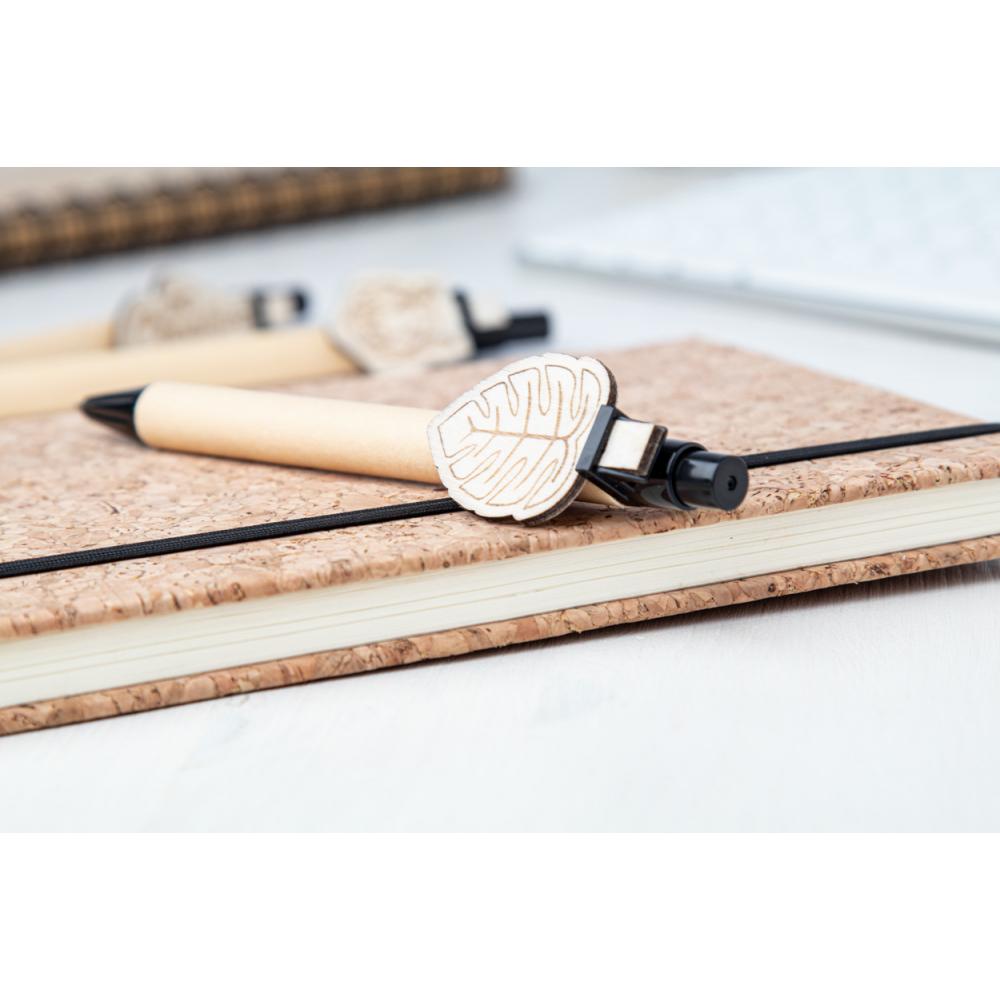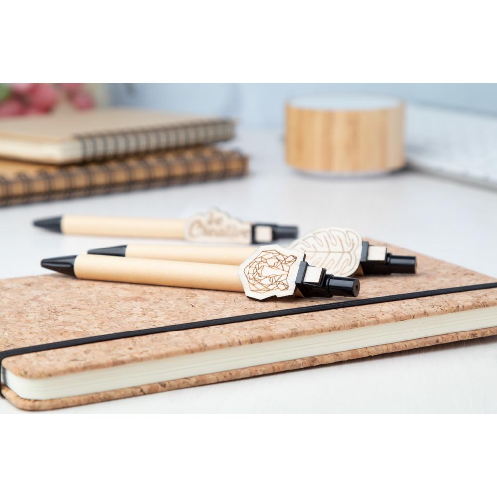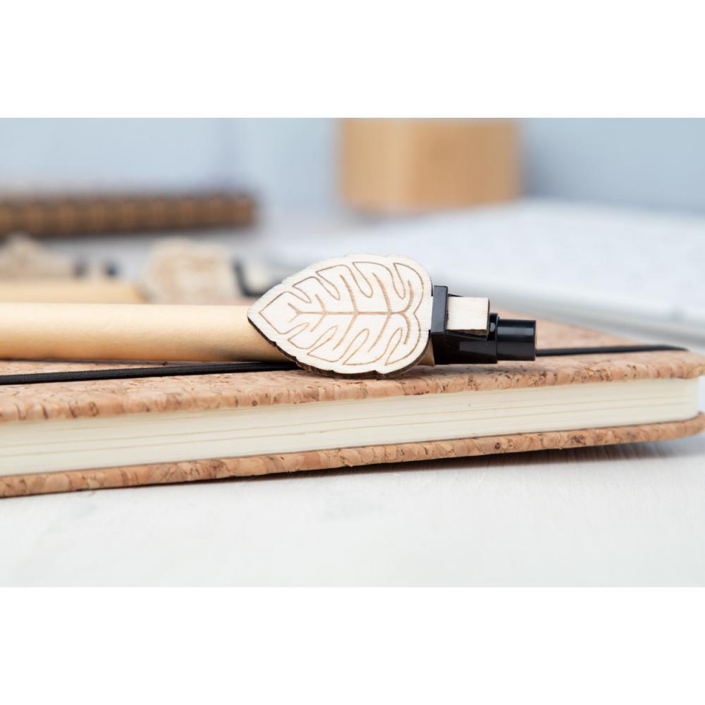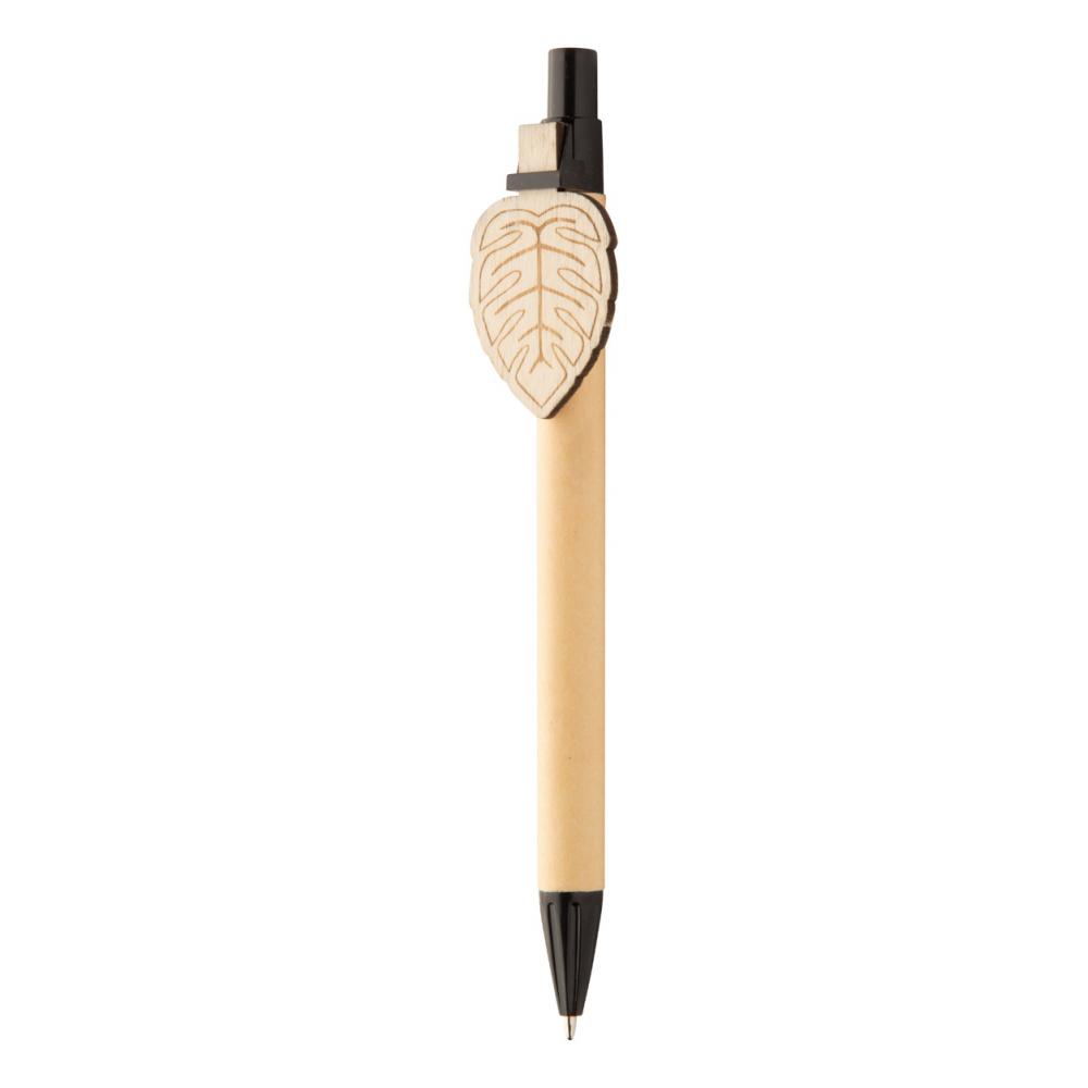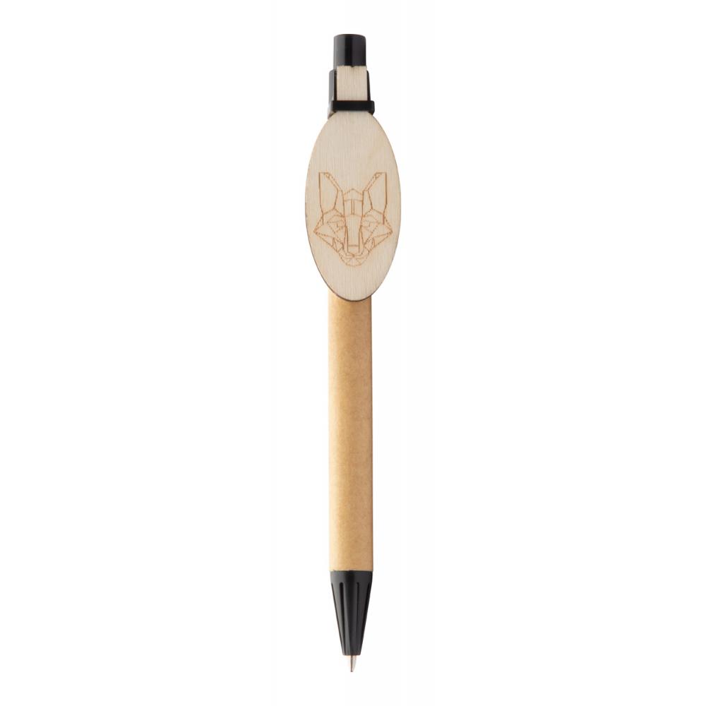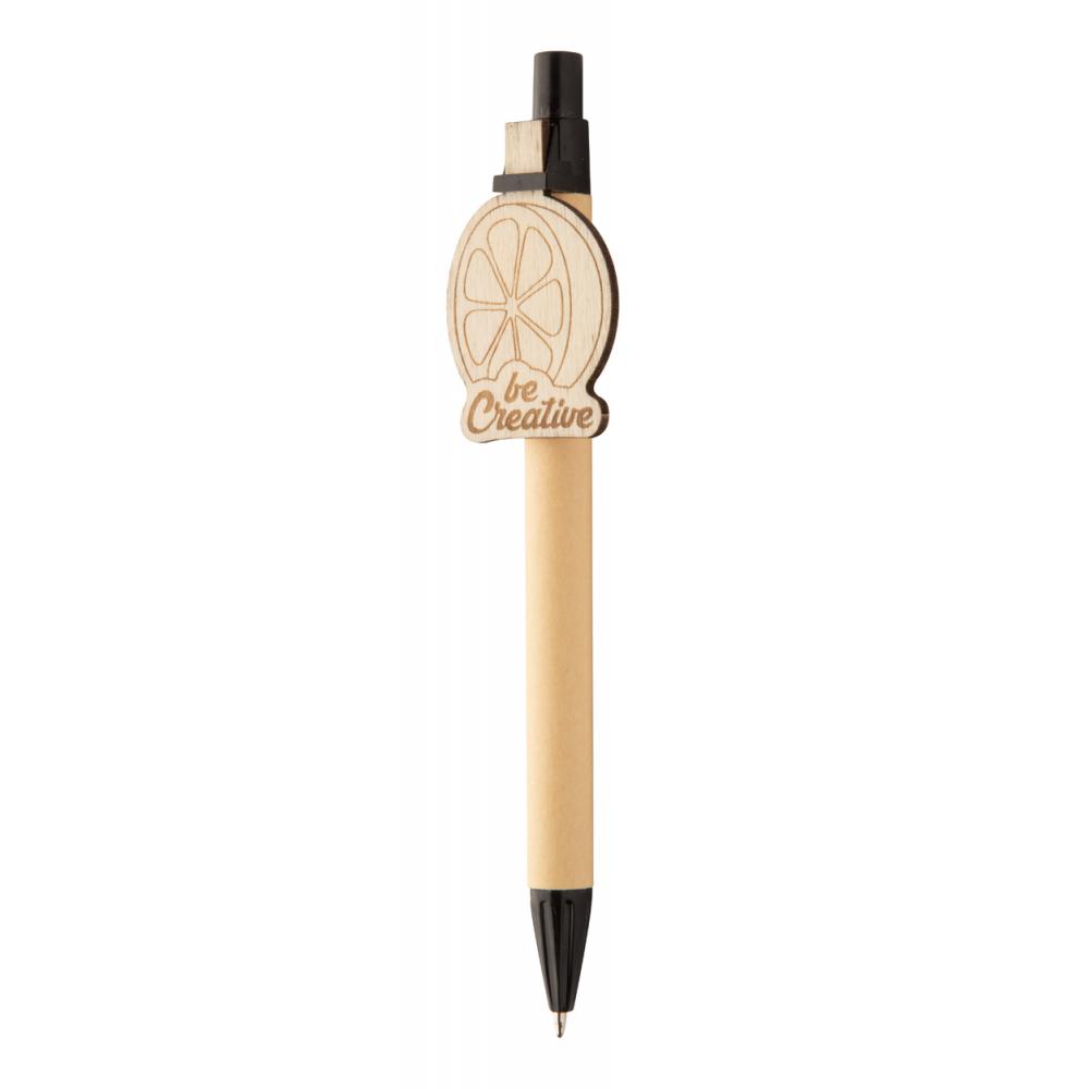 Шариковая ручка из переработанной бумаги с деревянным зажимом на заказ и синим стержнем. Клипса изготавливается нестандартной формы - максимальный размер: 25 × 35 мм. Цена включает гравировку логотипа на клипсе. Минимальный заказ: 100 шт.