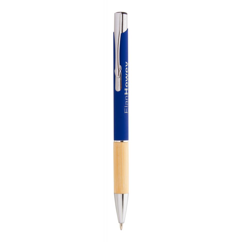 Алюминиевая шариковая ручка с бамбуковой ручкой, прорезиненным покрытием и синей заправкой. Со специальным покрытием для зеркальной лазерной гравировки.