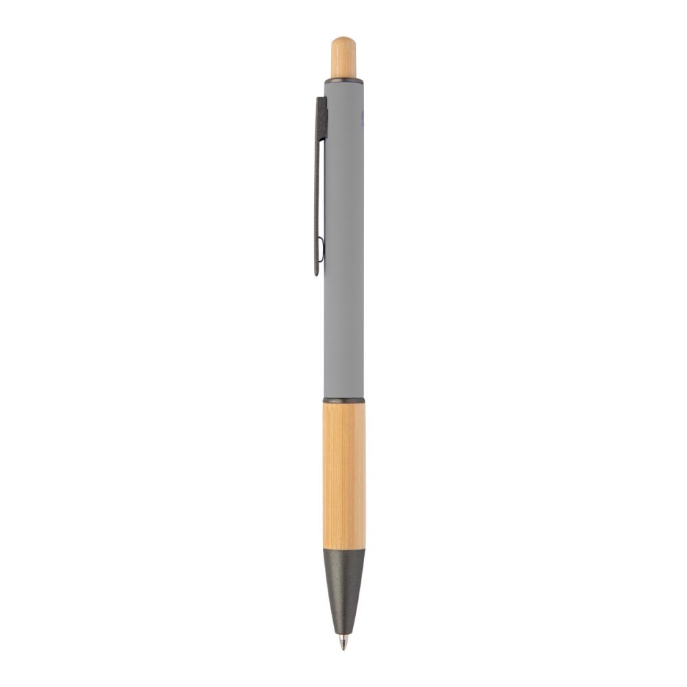 Шариковая ручка из переработанного алюминия с бамбуковой рукояткой и кнопкой, резиновым корпусом и деталями с графитовым покрытием. С синим заправочным стержнем.