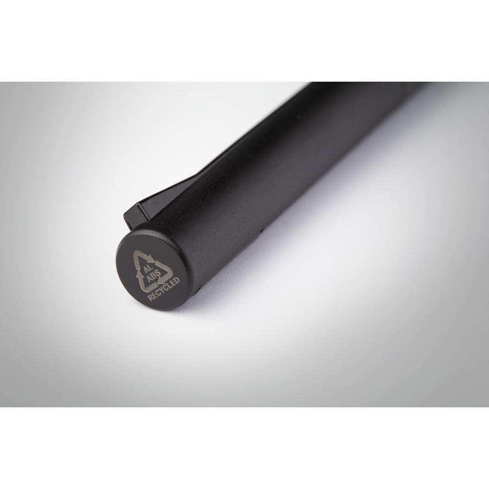 Шариковая ручка из переработанного алюминия в матовом металлическом цвете, с верхним баррелем из переработанного ABS и специальным механизмом клипа. С синим заправочным стержнем.