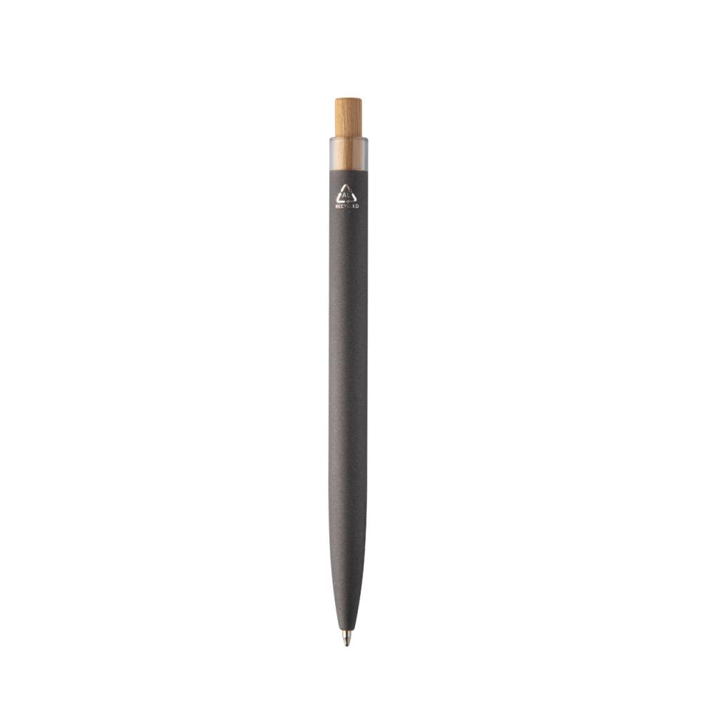 Шариковая ручка из переработанного алюминия с резиновым покрытием, кнопкой из бамбука и хромированным клипом. С особым покрытием для зеркальной лазерной гравировки. С синим заправочным стержнем.