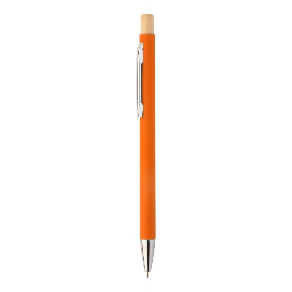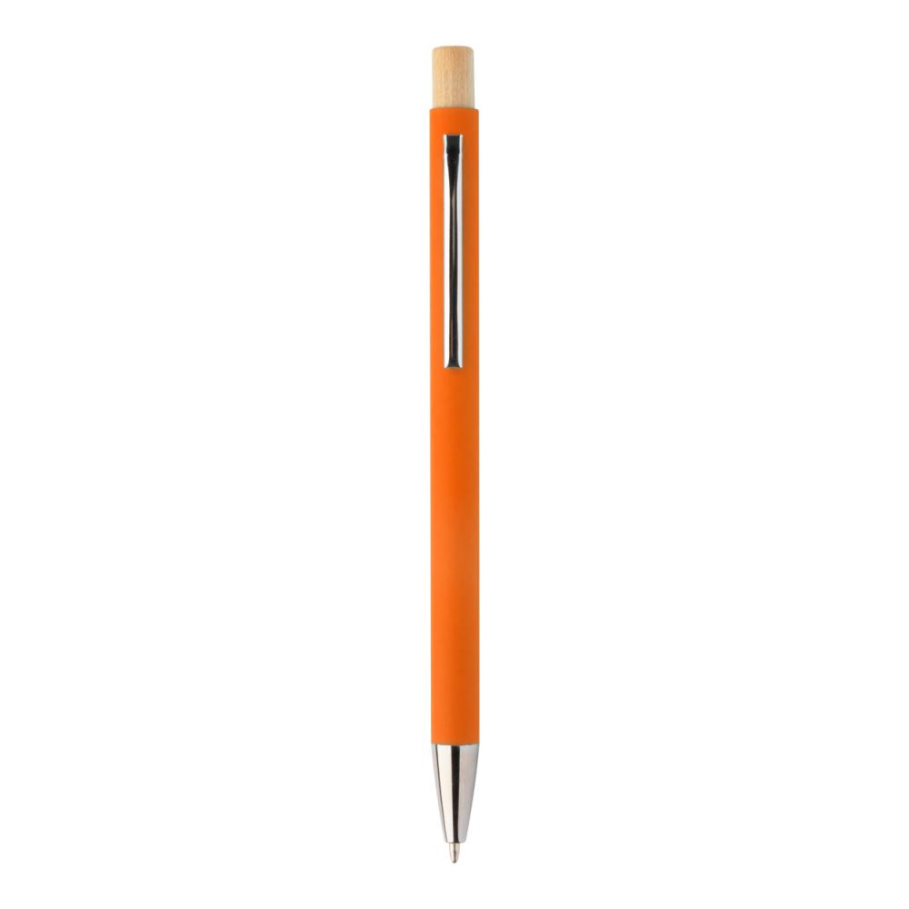 Шариковая ручка из переработанного алюминия с резиновым покрытием и кнопкой из бамбука и хромированными деталями. Специальное покрытие для зеркальной лазерной гравировки. С синим заправочным стержнем.