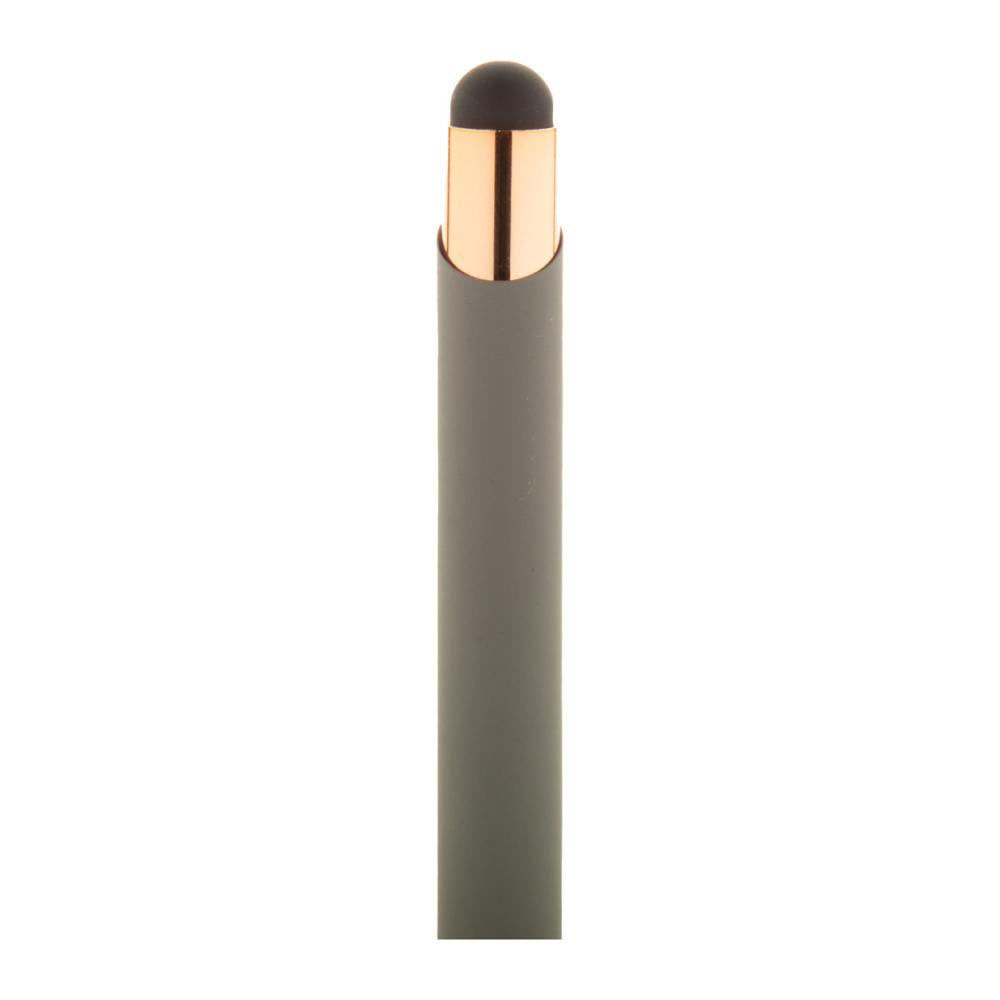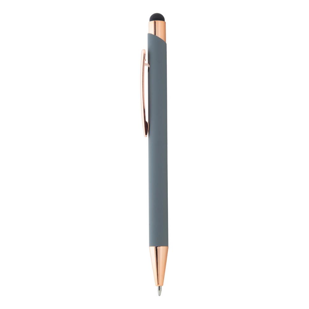 Переработанный алюминиевый шариковый и сенсорный ручка с резиновым покрытием и деталями из розового золота. С особым покрытием для зеркальной лазерной гравировки в цвете розового золота. С синим заправочным стержнем.
