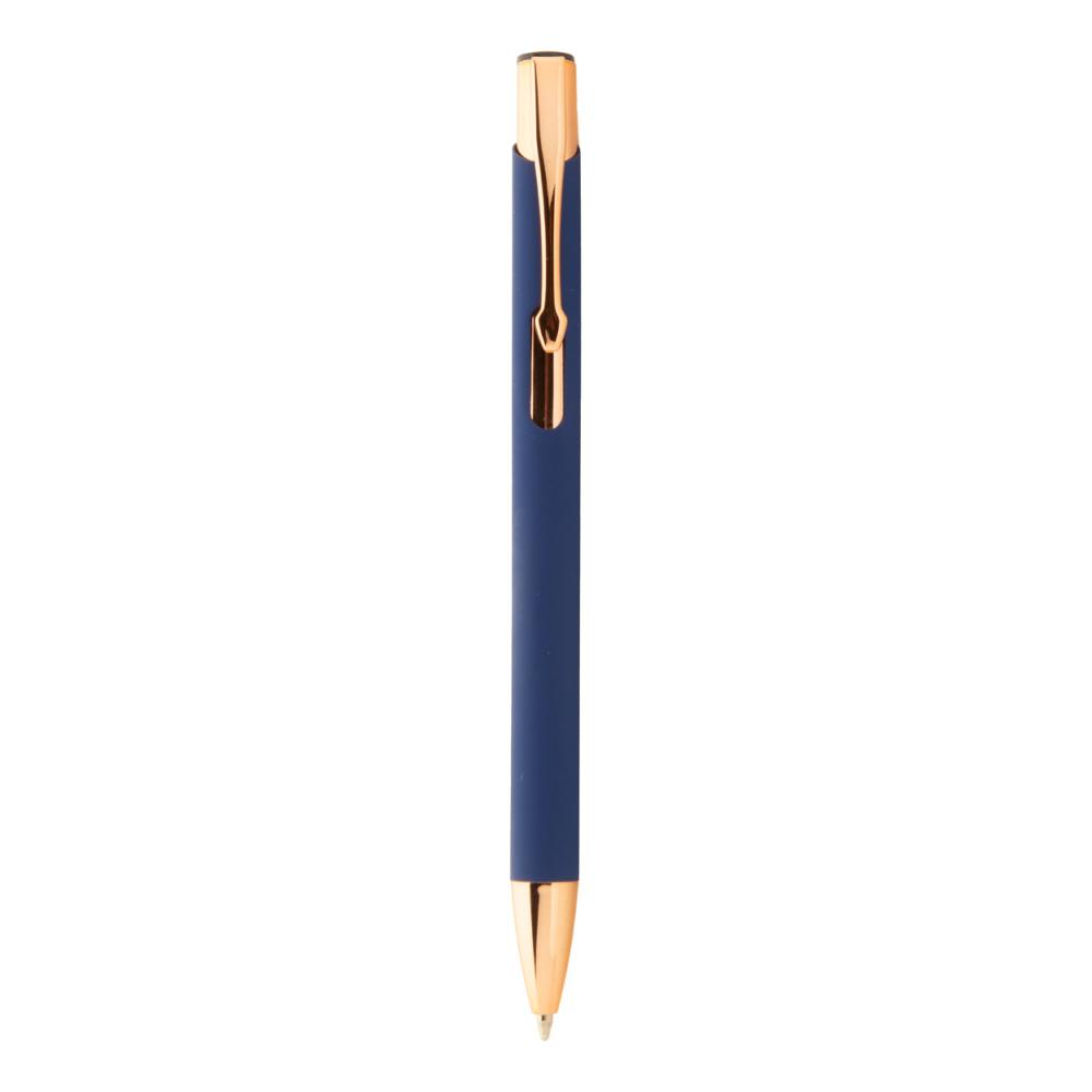 Переработанная алюминиевая шариковая ручка с резиновым покрытием и деталями из розового золота. Специальное покрытие для зеркальной лазерной гравировки в цвете розового золота. С синим заправочным стержнем.