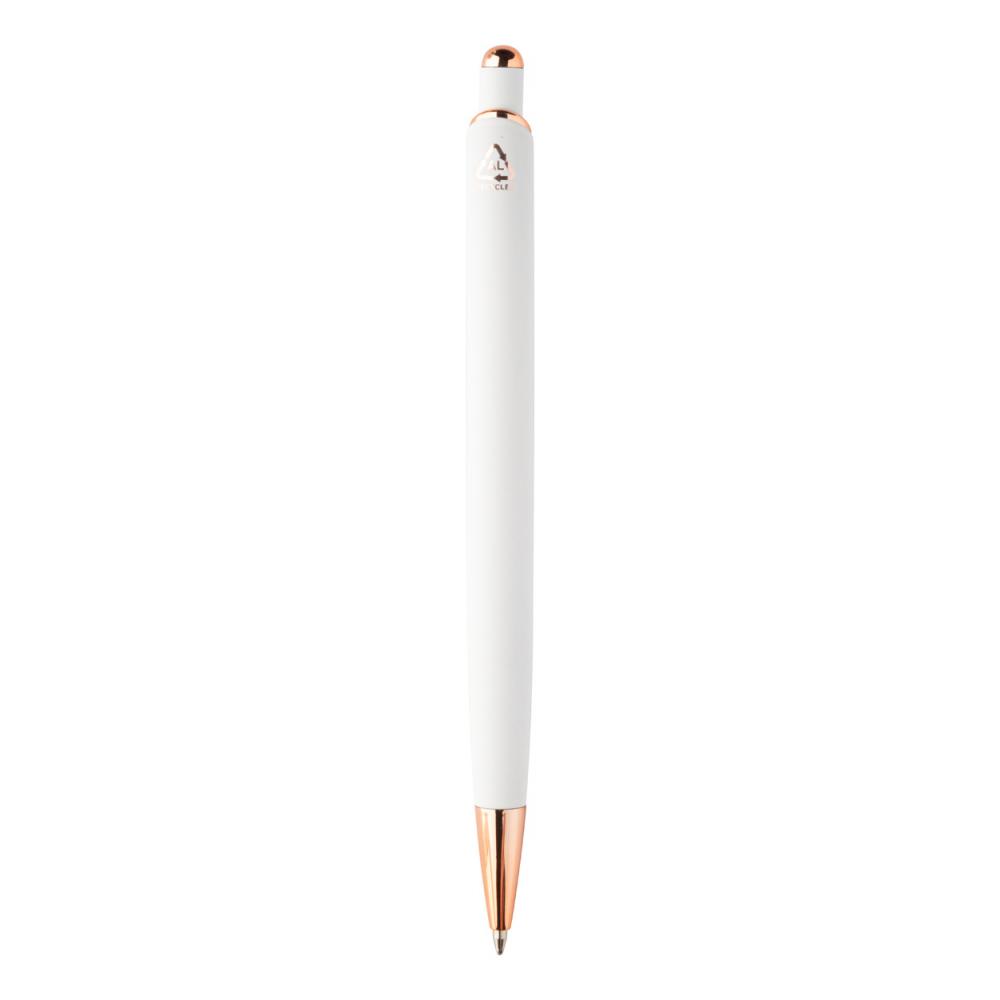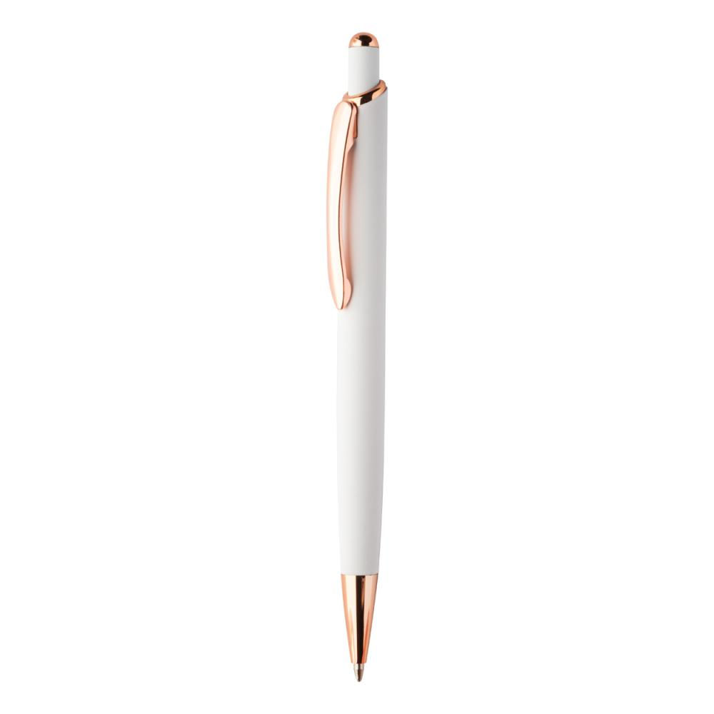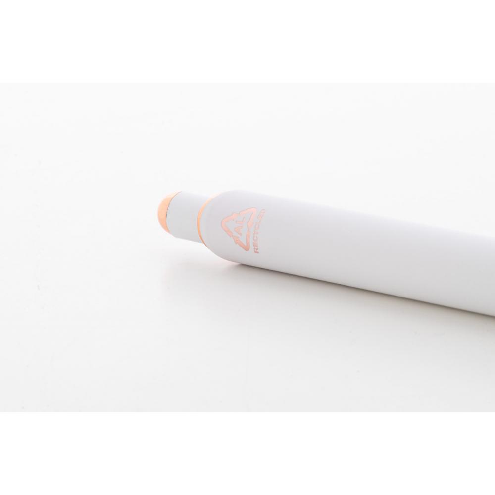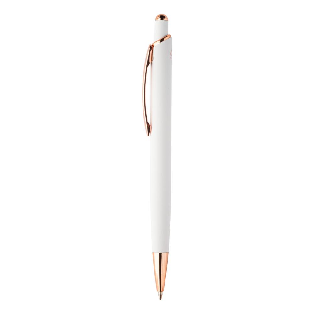 Шариковая ручка из переработанного алюминия с резиновым покрытием и деталями из розового золота. Специальное покрытие для зеркальной лазерной гравировки в цвете розового золота. С синим заправочным стержнем.