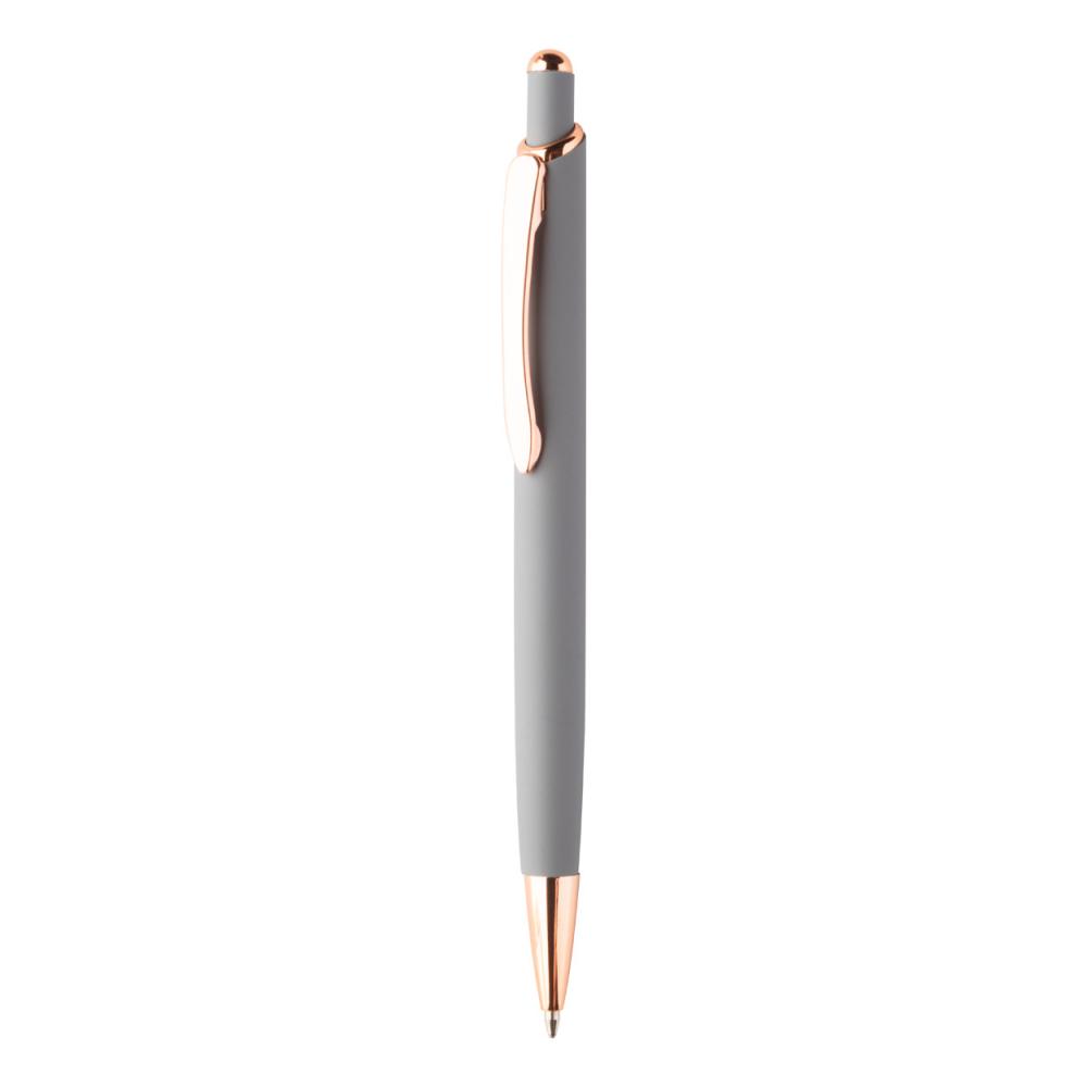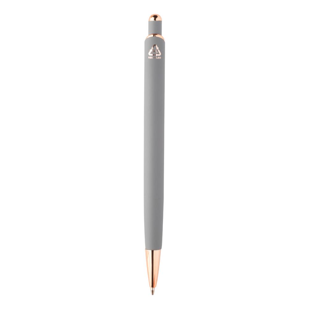 Шариковая ручка из переработанного алюминия с резиновым покрытием и деталями из розового золота. Специальное покрытие для зеркальной лазерной гравировки в цвете розового золота. С синим заправочным стержнем.