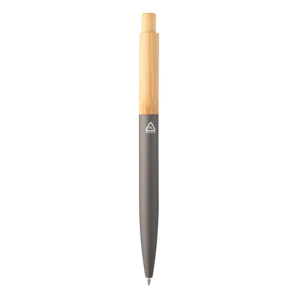 Шариковая ручка из бамбука и переработленного алюминия с резиновым покрытием и зажимом из гантельного металла. С синим стержнем.
