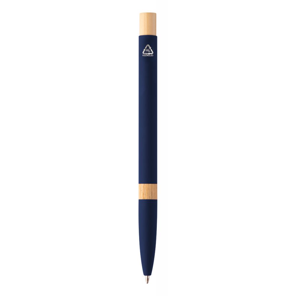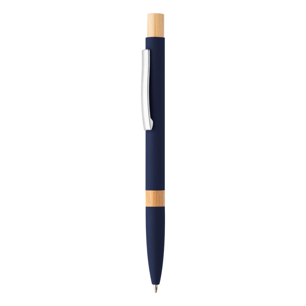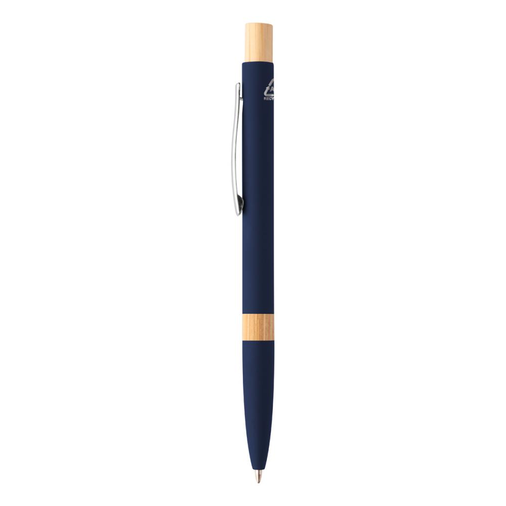 Шариковая ручка из переработанного алюминия с элементами из бамбука, резиновым покрытием и хромированным зажимом. Специальное покрытие для зеркальной лазерной гравировки. С синим стержнем.