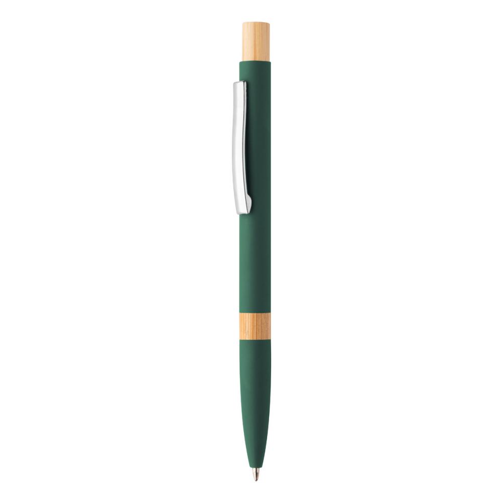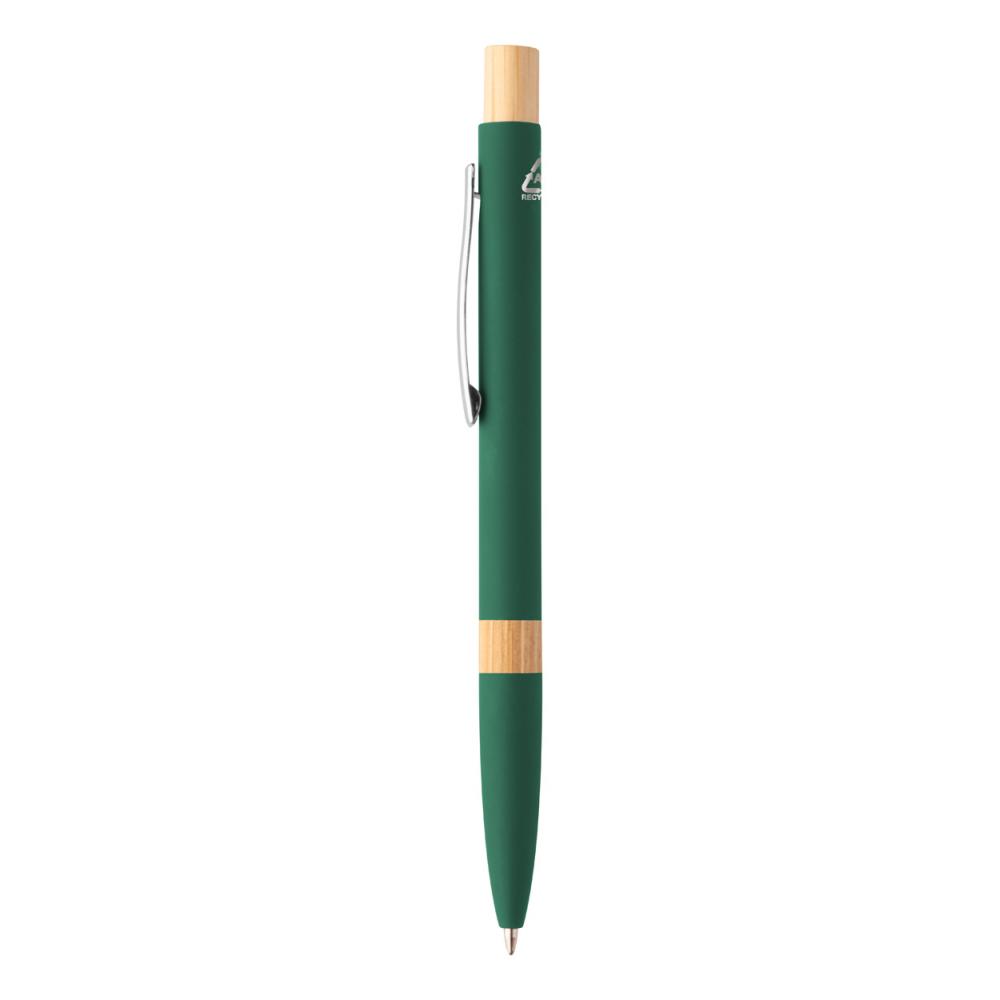 Шариковая ручка из переработанного алюминия с элементами из бамбука, резиновым покрытием и хромированным зажимом. Специальное покрытие для зеркальной лазерной гравировки. С синим стержнем.