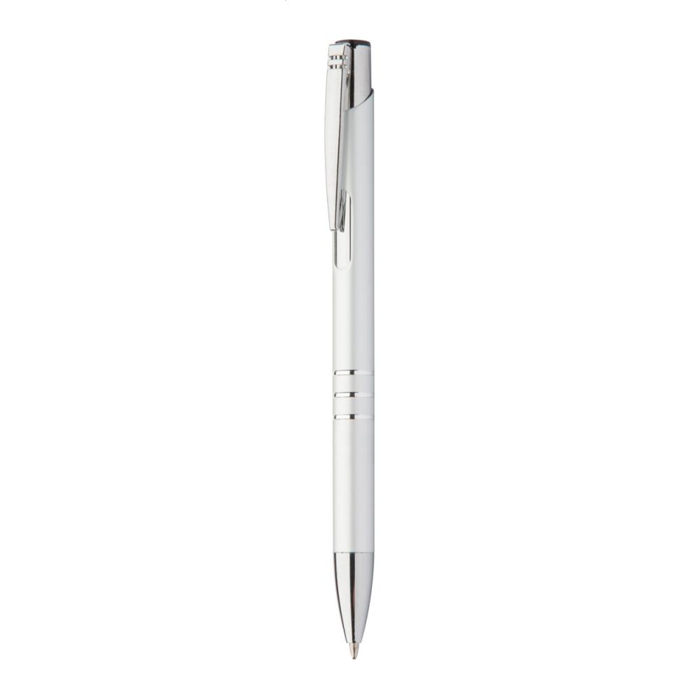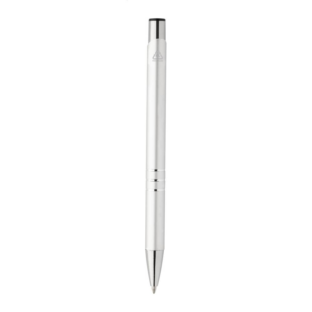 Шариковая ручка из переработанного алюминия с металлическим покрытием и синим стержнем.