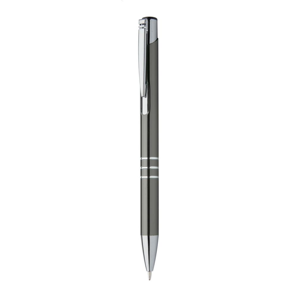 Шариковая ручка из переработанного алюминия с металлическим покрытием и синим стержнем.