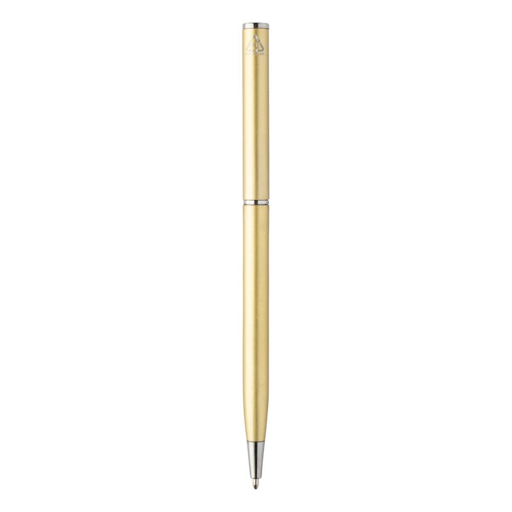 Переработанная алюминиевая шариковая ручка с хромированными деталями. С синим запасным стержнем.