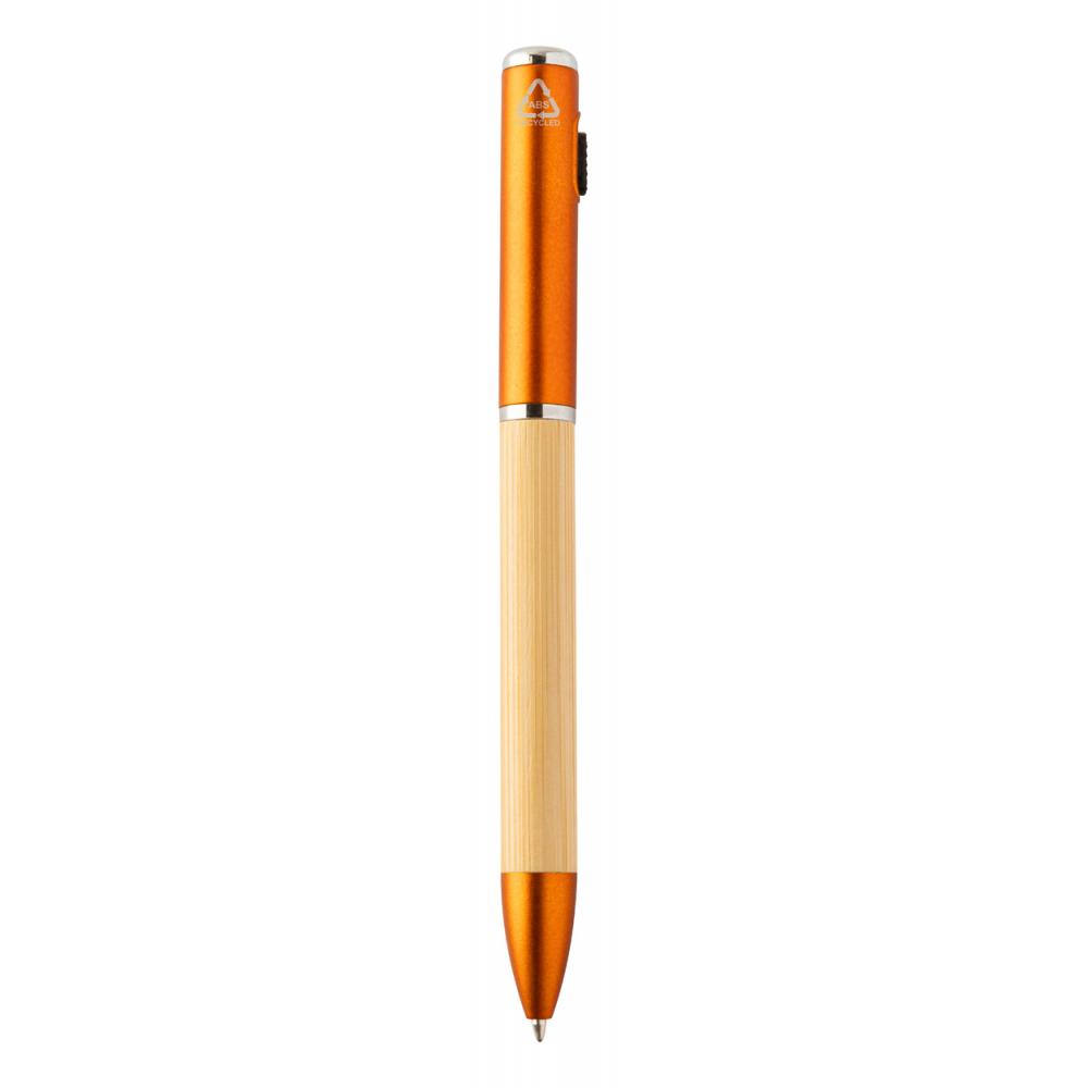 Ручка-роллер с поворотным механизмом из бамбука и переработленного пластика ABS с 1 светодиодным фонариком. С синим стержнем и батарейкой кнопочного типа.