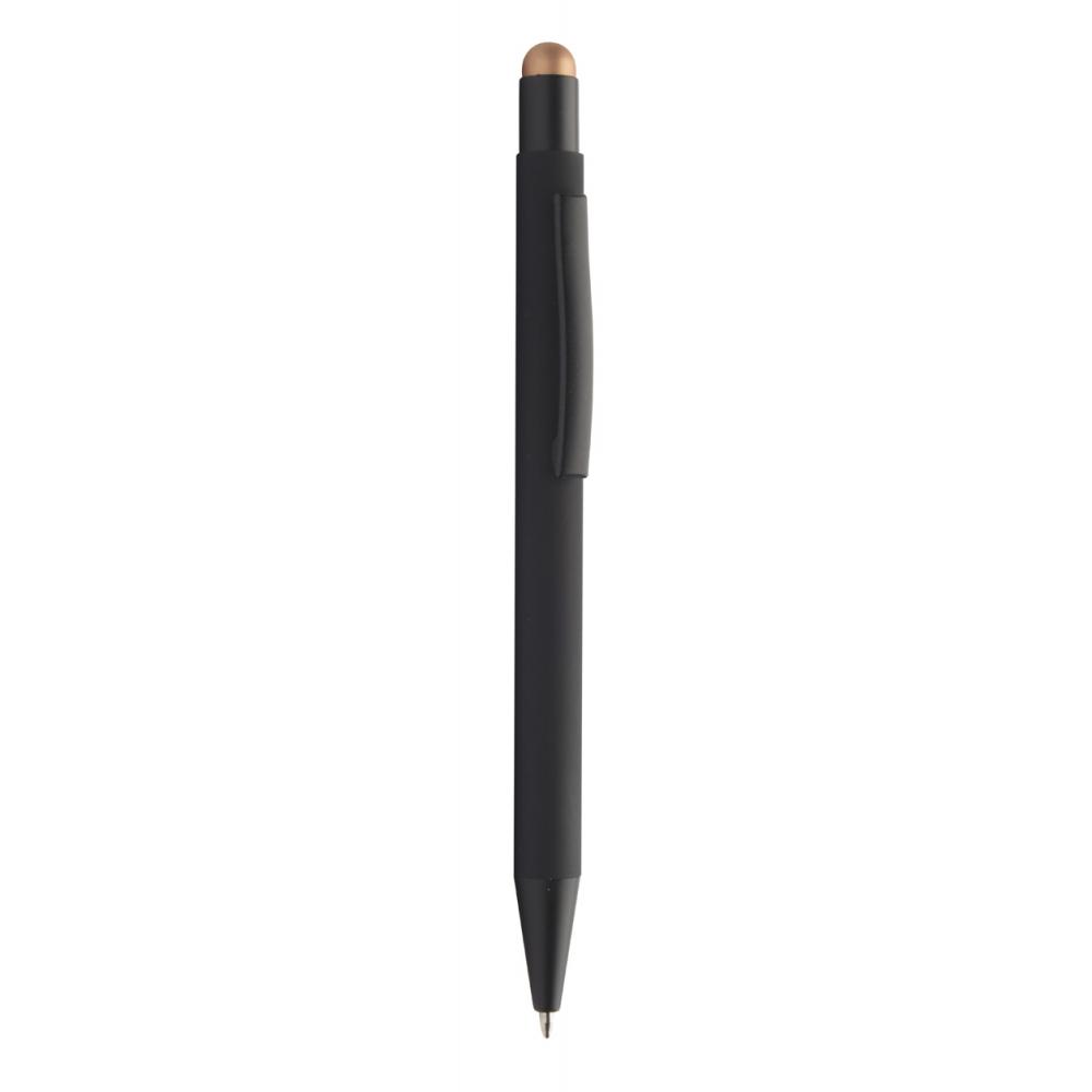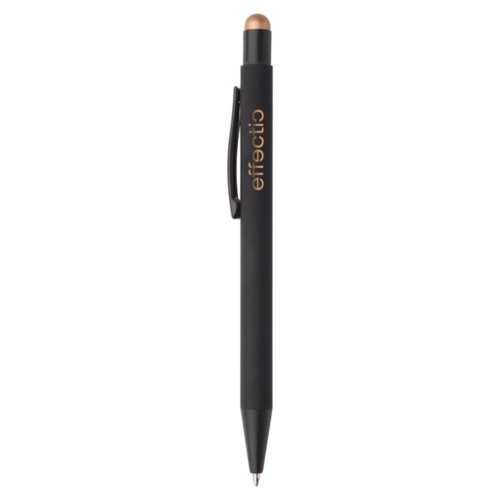 Алюминиевая шариковая ручка и ручка для сенсорного экрана с прорезиненным покрытием. Со специальным покрытием для зеркальной гравировки под цвет стилуса. С синим стержнем.