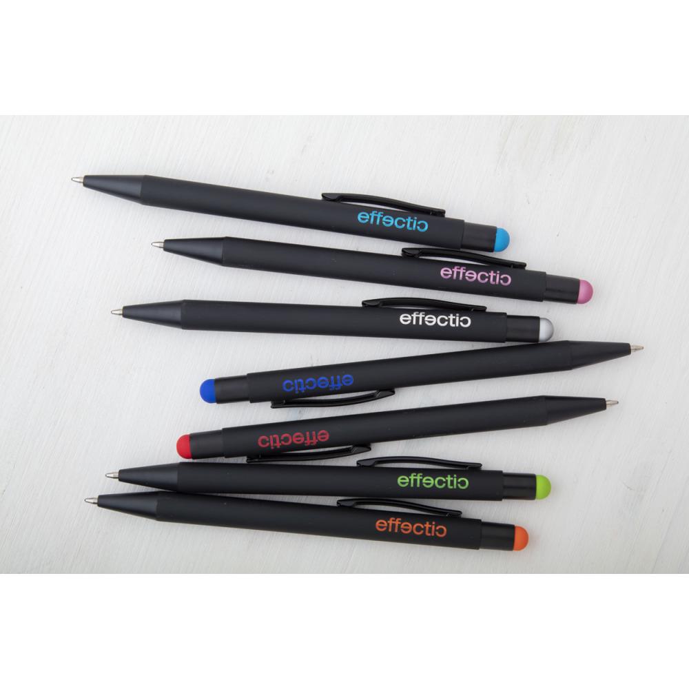 Алюминиевая шариковая ручка и ручка для сенсорного экрана с прорезиненным покрытием. Со специальным покрытием для зеркальной гравировки под цвет стилуса. С синим стержнем.