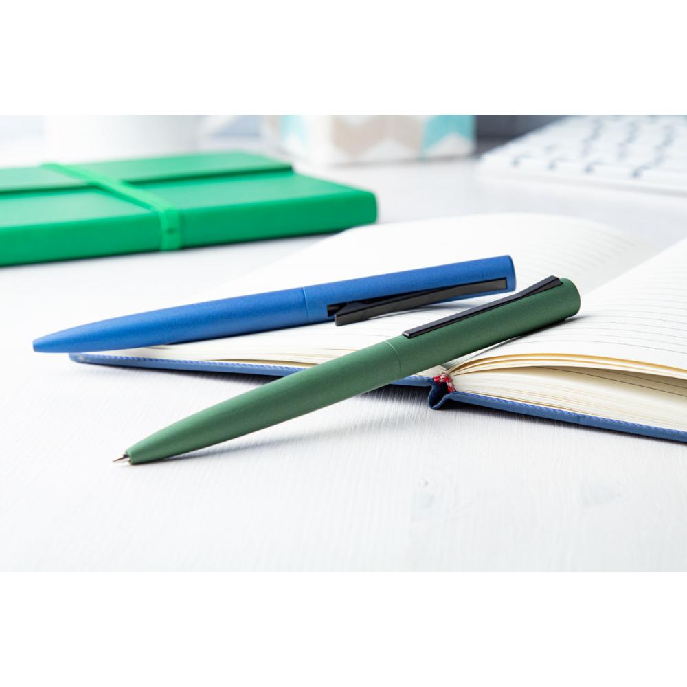 Шариковая ручка матового металлического цвета с алюминиевым корпусом и специальным зажимом. С синим стержнем.