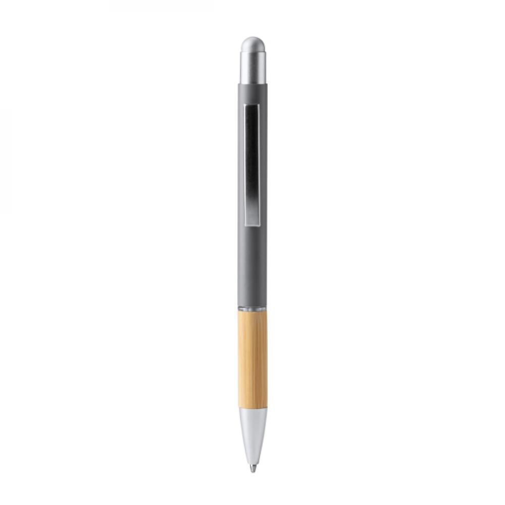 Металлическая шариковая ручка в матовой отделке с бамбуковой рукояткой и сенсорным указателем. Синяя чернила.