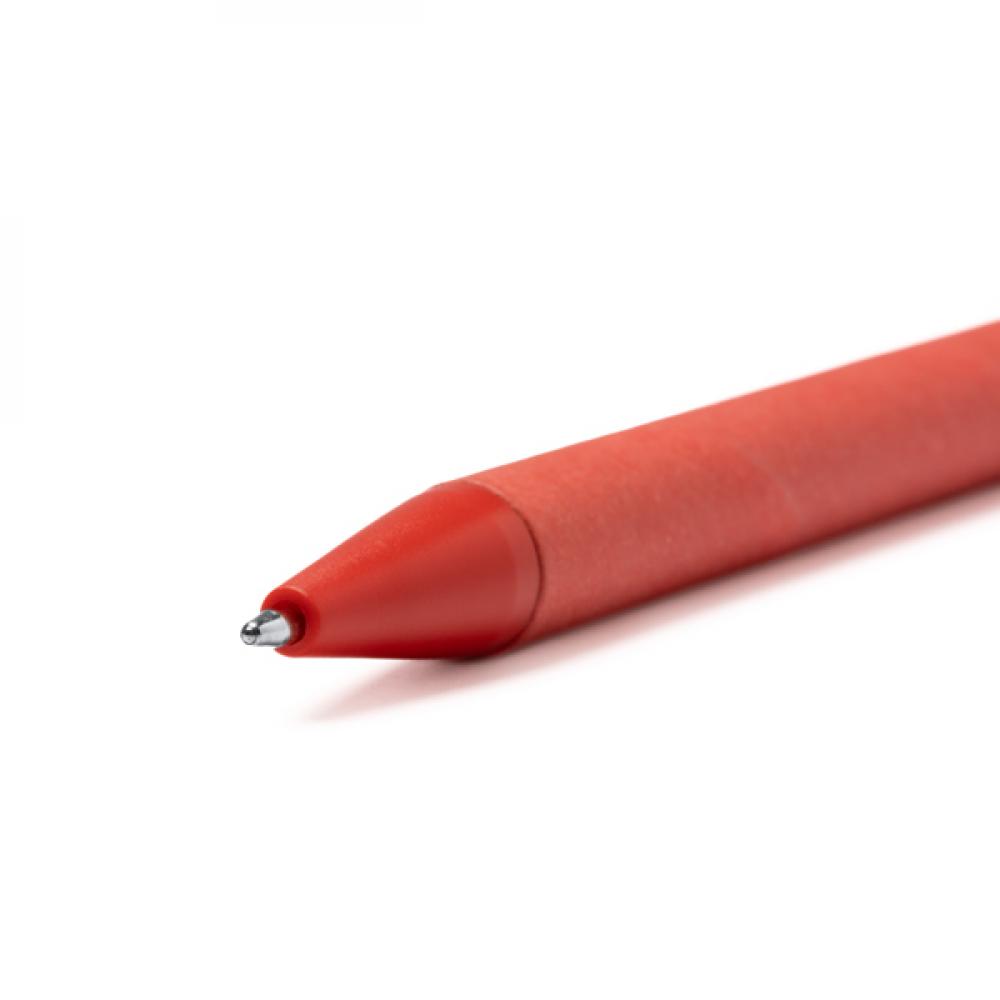 Ручка с кнопкой с корпусом из переработанного картона, наконечником и зажимом из переработанного ABS. Синий стержень.