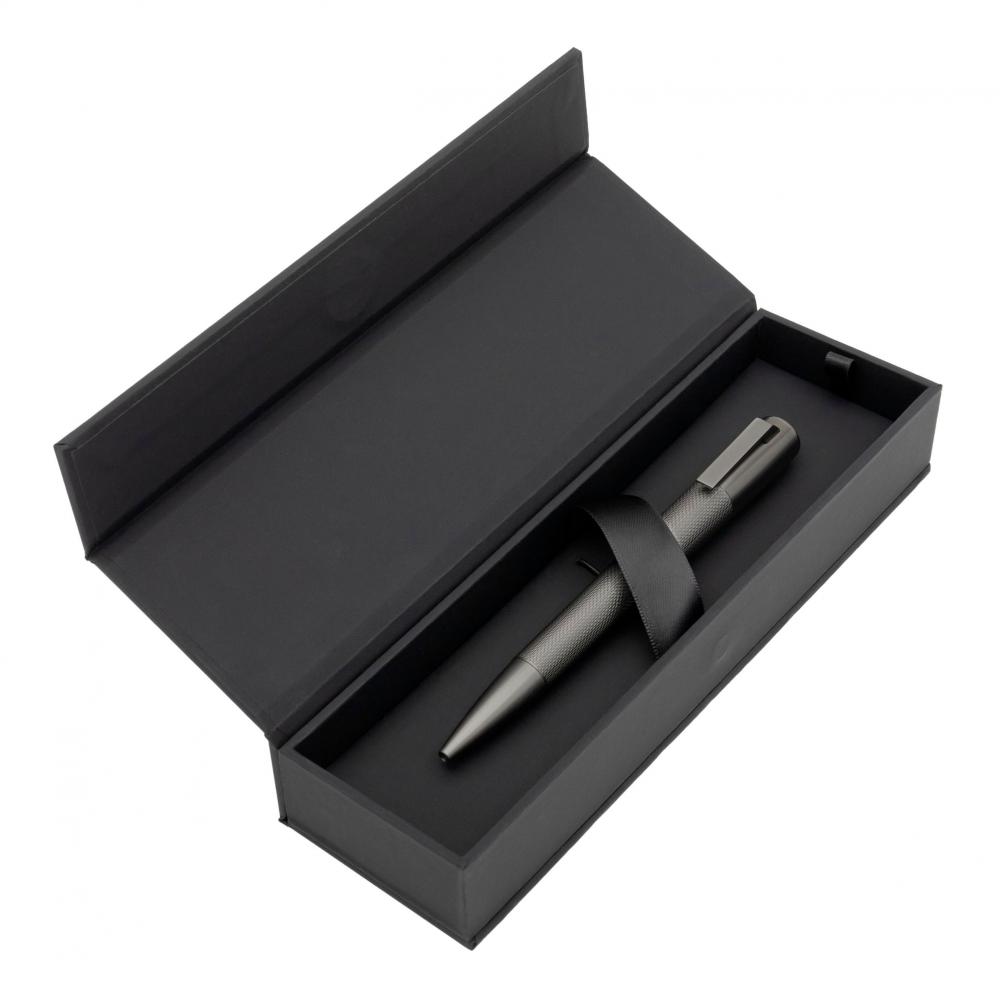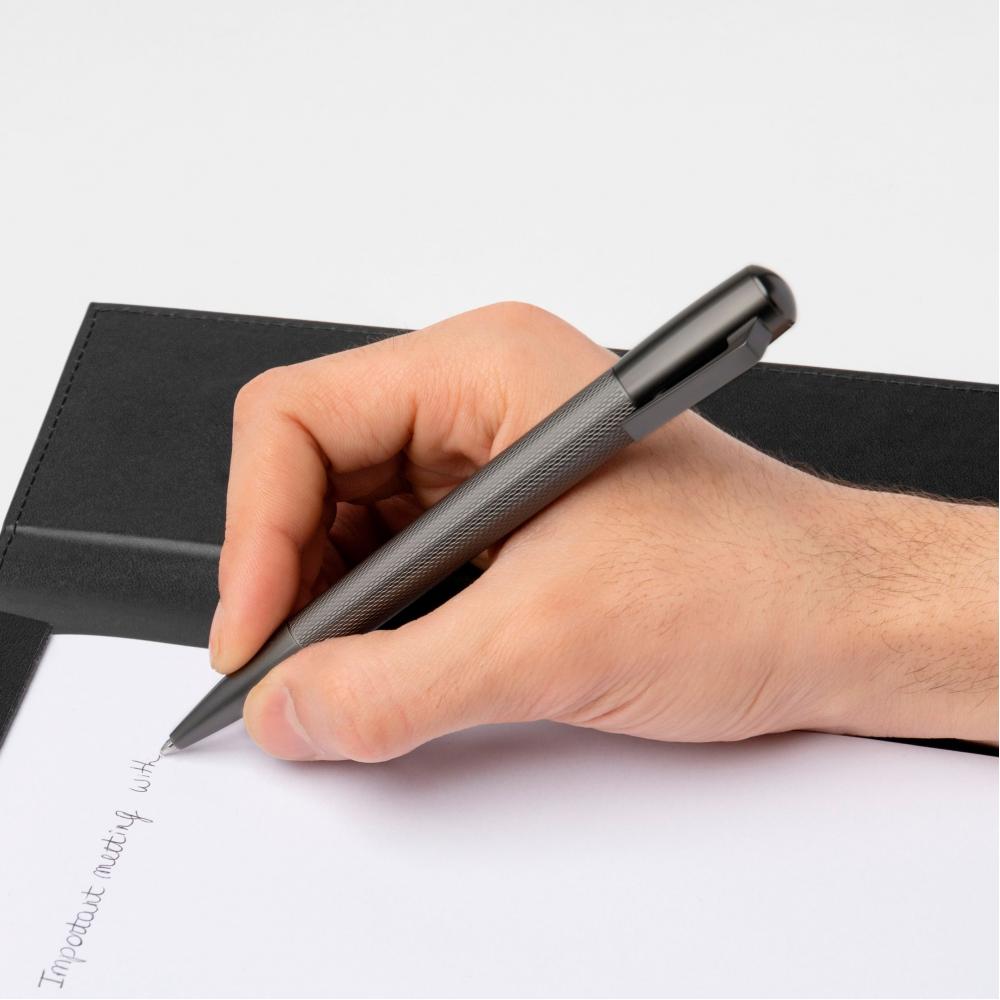 Линейка Pure с её сужающимся, но аэродинамичным силуэтом переосмысляет современные линии, сочетая их с конструктивной простотой. Шариковая ручка Pure Matte Dark Chrome объединяет техническую точность и сложный графический узор, создавая тактильное ощущение письма на пересечении функциональности и дизайна. Логотип HUGO BOSS выгравирован.