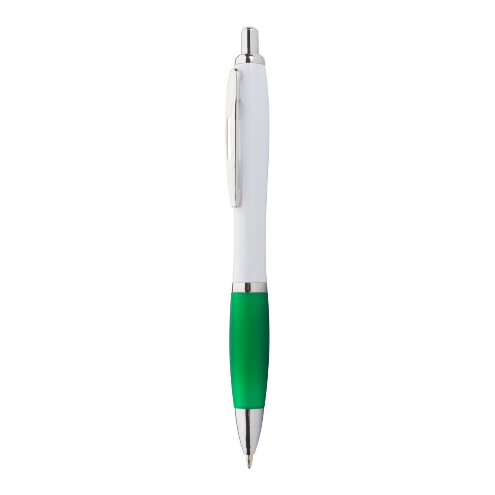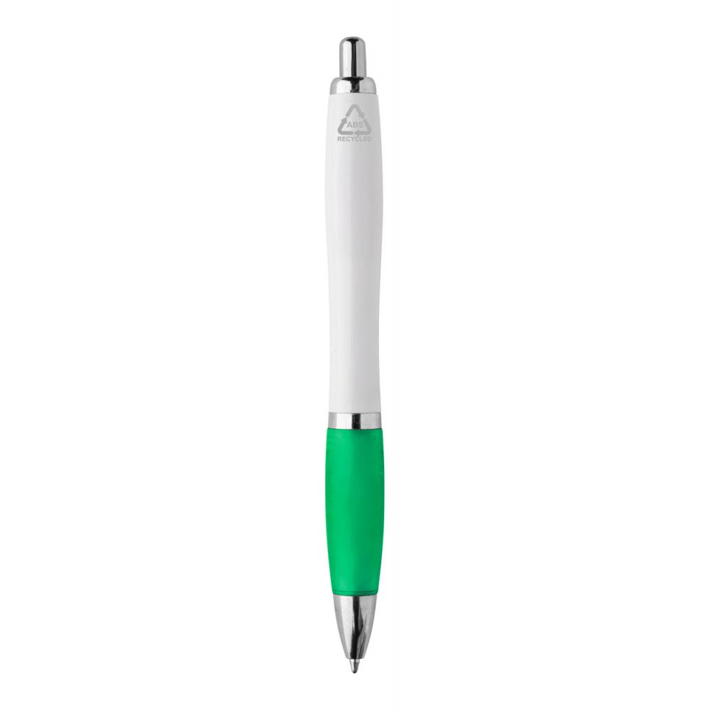 Шариковая ручка из переработанного пластика ABS с белым корпусом, цветным хватом и хромированными деталями. С синим стержнем.