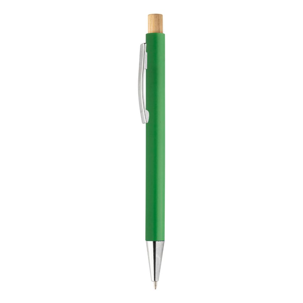 Шариковая ручка из переработанного пластика ABS с кнопкой из бамбука и металлическим зажимом. С синим стержнем.