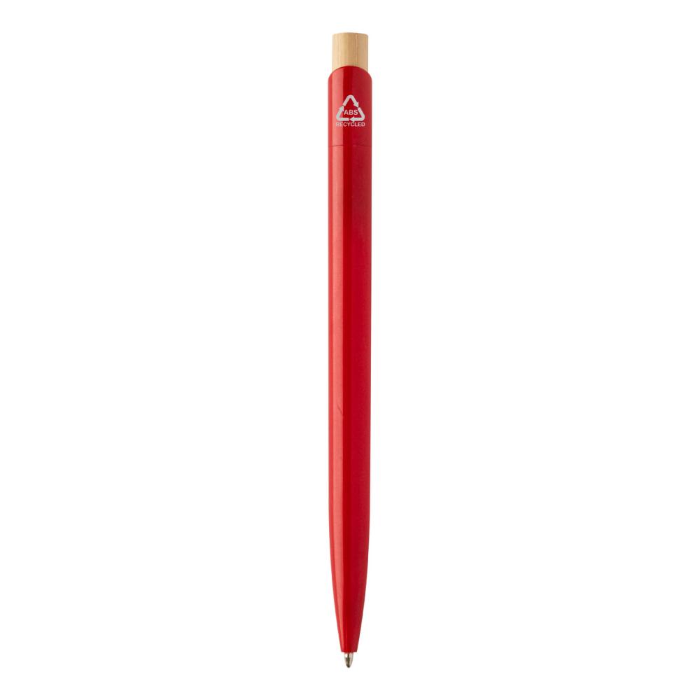 Шариковая ручка из переработанного пластика ABS с кнопкой из бамбука. С синим стержнем.