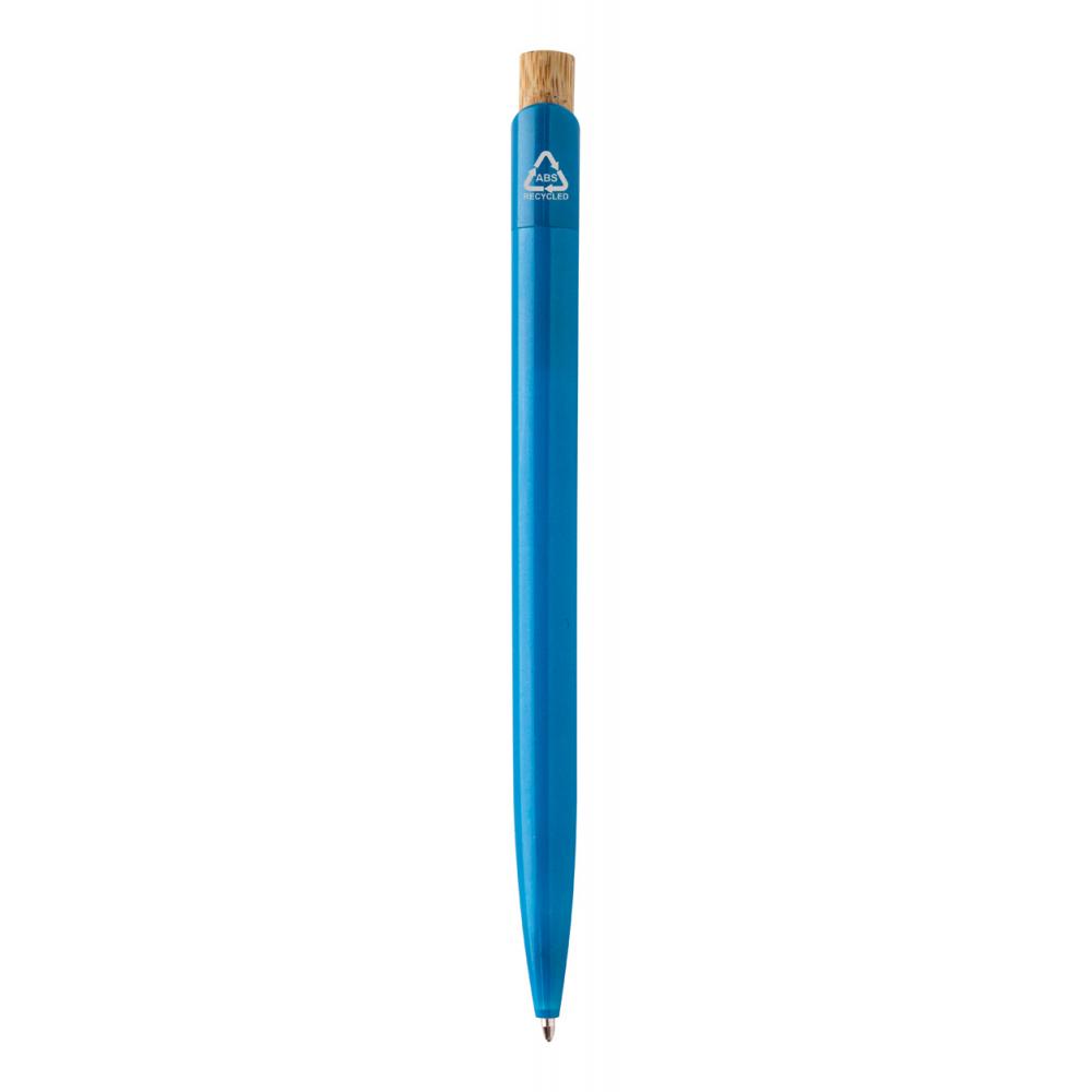 Шариковая ручка из переработанного пластика ABS с кнопкой из бамбука. С синим стержнем.