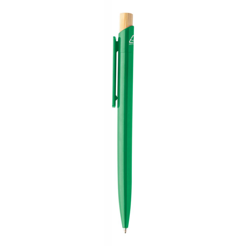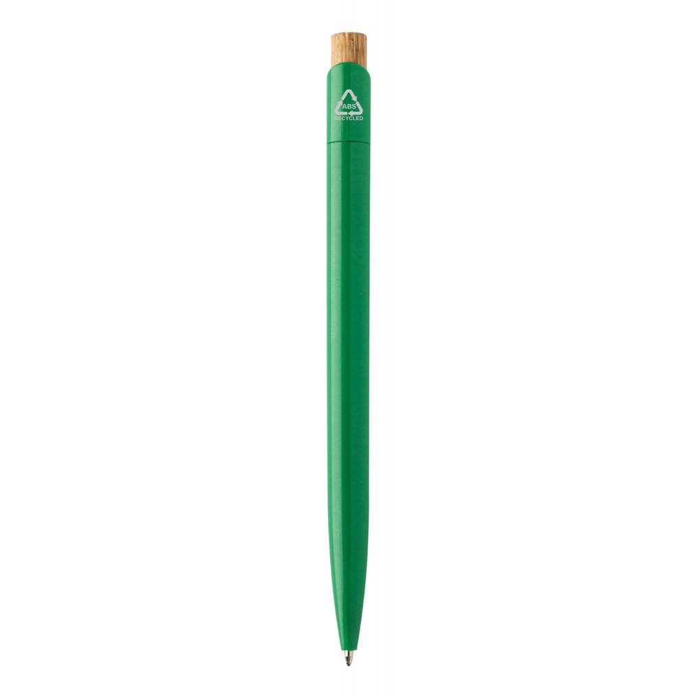 Шариковая ручка из переработанного пластика ABS с кнопкой из бамбука. С синим стержнем.