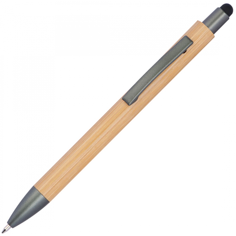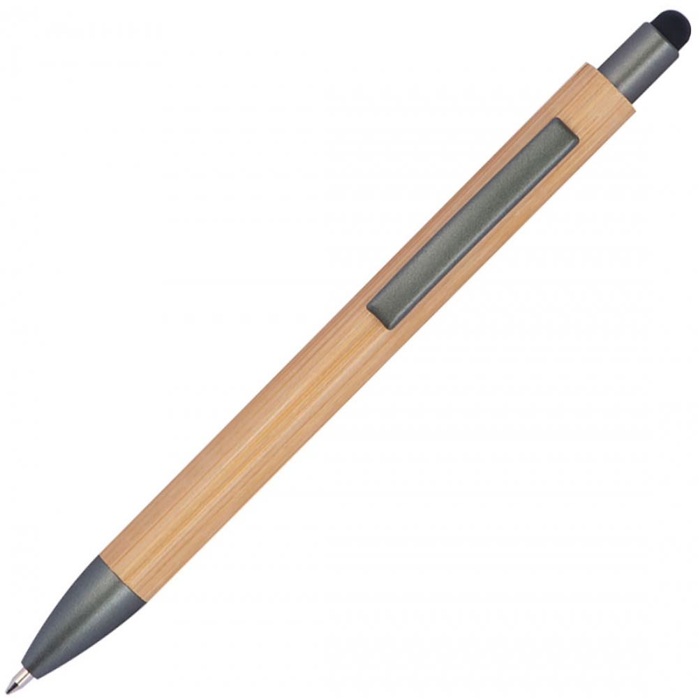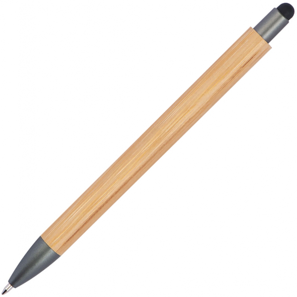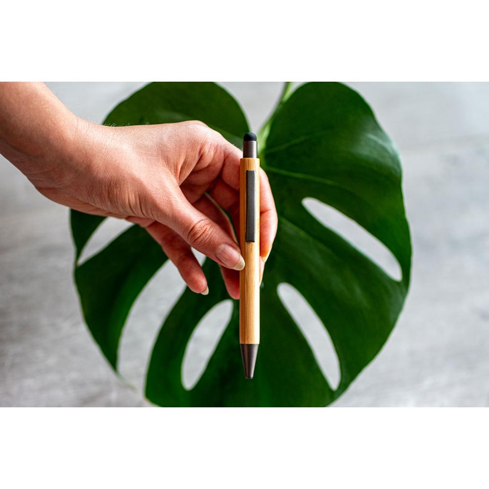 Шариковая ручка с бамбуковым покрытием, большим стержнем с синими чернилами, элементами антрацитового цвета и стилусом для сенсорного экрана.