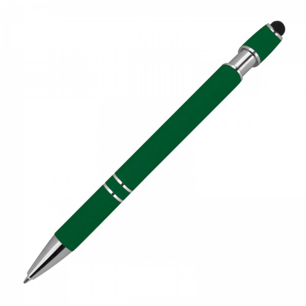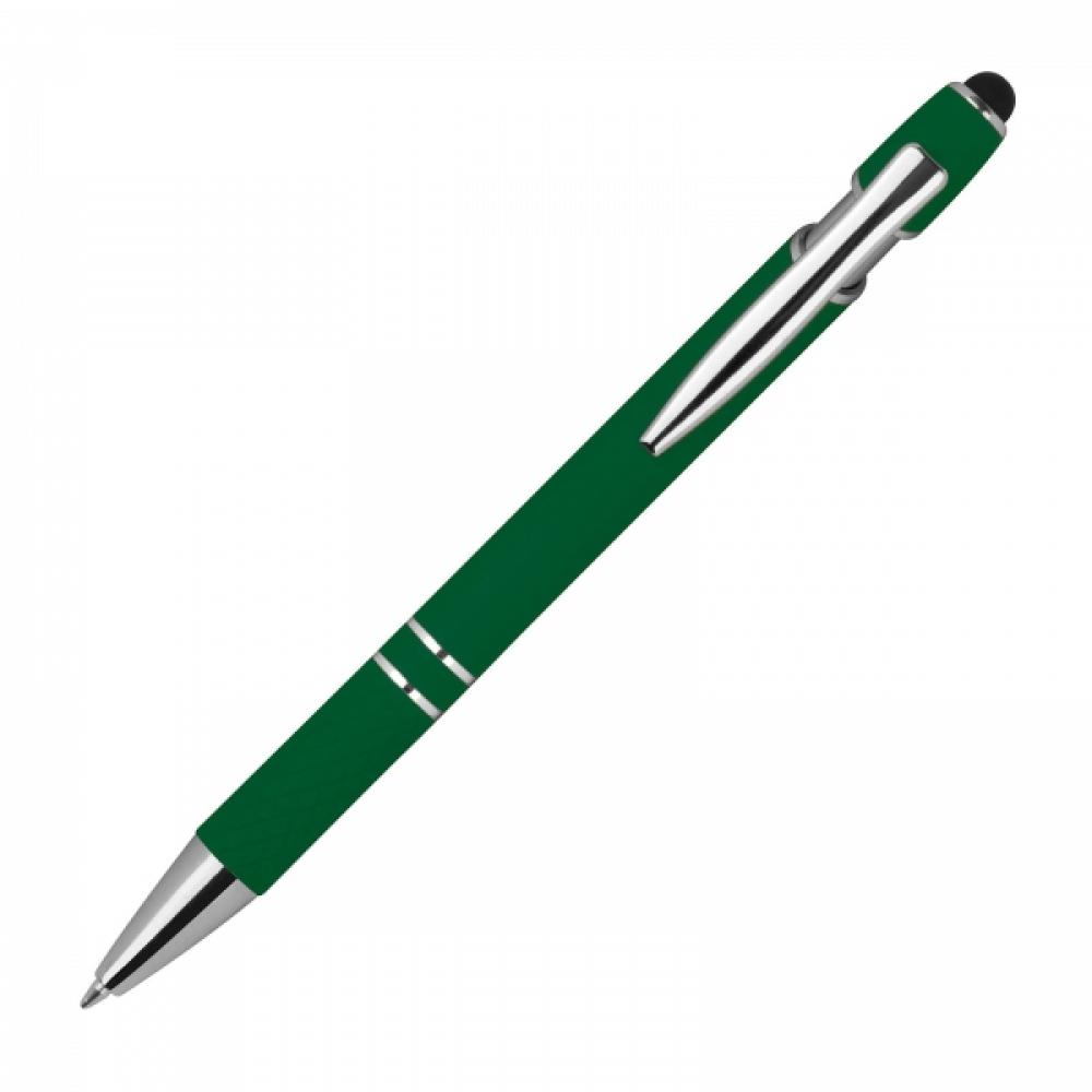 Пластиковая ручка с серебристыми элементами, синие чернила, наконечник стилуса для работы с сенсорным экраном и прорезиненная зона захвата.