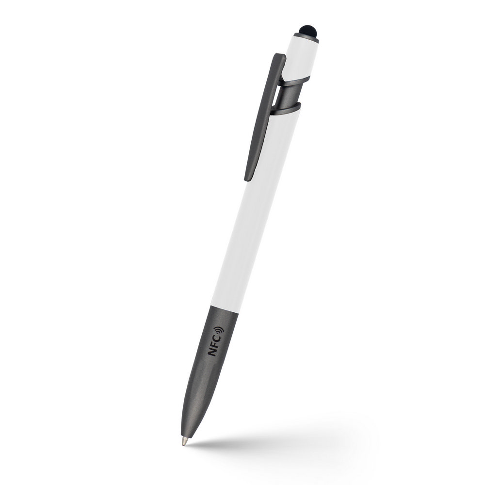 Шариковая ручка с чипом NFC (ближней беспроводной связи), работает с мобильными устройствами с технологией NFC, имеет матовый корпус с резиновым покрытием и деталями отделки в графитовом цвете, кончик-стилус обеспечивает работу с сенсорным экраном, пишет синим цветом, после гравировки появляется блестящая поверхность. NFC - это международный стандарт связи для беспроводного обмена данными на короткие расстояния, например, ссылка на веб-адрес может быть загружена на чип, который может быть прочитан мобильным устройством с технологией NFC после приближения к логотипу NFC на изделии. Изделие изготовлено из переработанного алюминия и пластика.