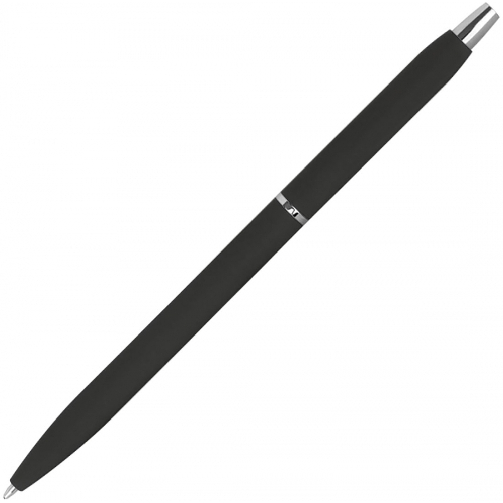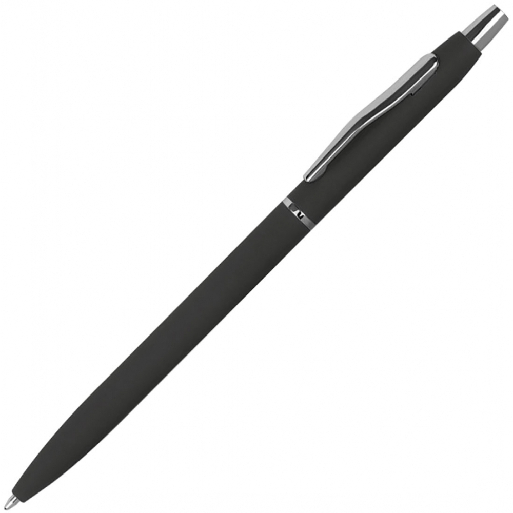 Тонкая металлическая ручка с резиновым покрытием в различных цветах, с серебристыми элементами и черной пастой. Мы нанесем ваш логотип справа от клипа.