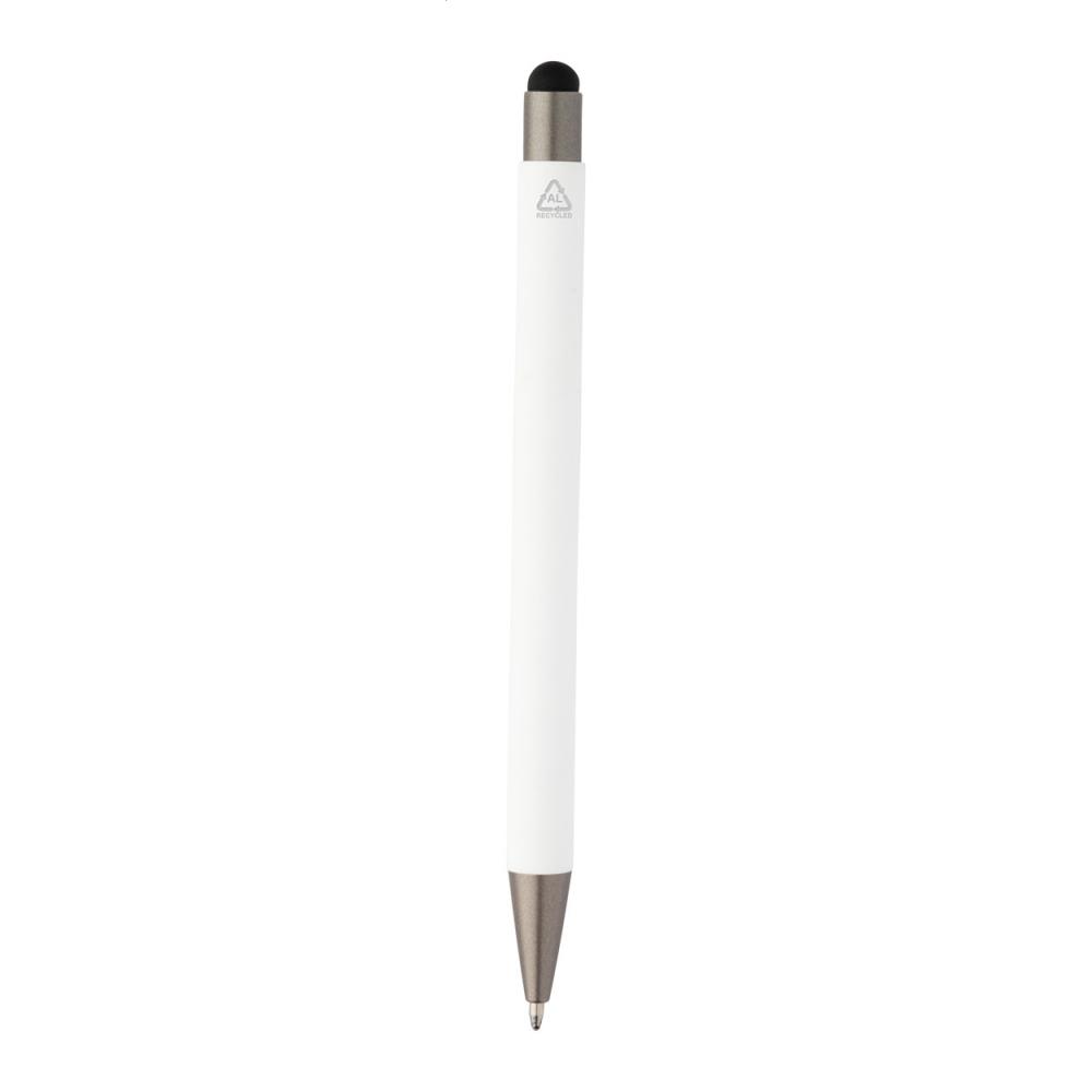 Шариковая ручка и стилус из переработанного алюминия с резиновым корпусом и деталями с покрытием из гантельного металла. С синим заправочным стержнем.